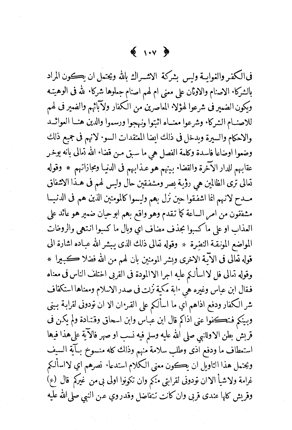 في الكفر والغواية وليس بشركة الاشراك بالله ويحتمل أن يكون المراد بالشركاء الأصنام والأوثان على معنى أم لهم أصنام جعلوها شركاء لله في ألوهيته ويكون الضمير في شرعوا لهؤلاء المعاصرين من الكفار ولآبائهم والضمير في لهم للاصنام الشركاء وشرعوا معناه أثبتوا ونهجوا ورسموا والدين هنا العوائد والأحكام والسيرة ويدخل في ذلك أيضا المعتقدات السوء لأنهم في جميع ذلك وضعوا أوضاعا فاسدة وكلمة الفصل هي ما سبق من قضاء الله تعالى بأنه يؤخر عقابهم للدار الآخرة والقضاء بينهم هو عذابهم في الدنيا ومجازاتهم وقوله تعالى ترى الظالمين هي رؤية بصر ومشفقين حال وليس لهم في هذا الاشفاق مدح لأنهم انما شفقوا حين نزل بهم وليسوا كالمؤمنين الذين هم في الدنيا مشفقون من أمر الساعة كما تقدم وهو واقع بهم أبو حيان ضمير هو عائد على العذاب أو على ما كسبوا بحذف مضاف أي وبال ما كسبوا انتهى والروضات المواضع المونقة النضرة وقوله تعالى ذلك الذي يبشر الله عباده اشارة الى قوله تعالى في الآية الأخرى وبشر المؤمنين بأن لهم من الله فضلا كبيرا وقوله تعالى قل لا أسلألكم عليه أجرا الا المودة في القربى اختلف الناس في معناه فقال ابن عباس وغيره هي آية مكية نزلت في صدر الاسلام ومعناها استكفاف شر الكفار ودفع أذاهم أي ما أسالكم على القرآن الا أن تودوني لقرابة بيني وبينكم فتكفوا عني أذاكم قال ابن عباس وابن اسحاق وقتادة ولم يكن في قريش بطن الا وللنبي صلى الله عليه و سلم فيه نسب أو صهر فالآية على هذا فيها استعطاف ما ودفع اذى وطلب سلامة منهم وذلك كله منسوخ بآية السيف ويحتمل هذا التأويل أن يكون معنى الكلام استدعاء نصرهم أي لا اسالكم غرامة ولا شيئا إلا أن تودوني لقرابتي منكم وأن تكونوا أولى بي من غيركم قال ع وقريش كلها عندي قربى وان كانت تتفاضل وقد روى عن النبي صلى الله عليه و سلم
