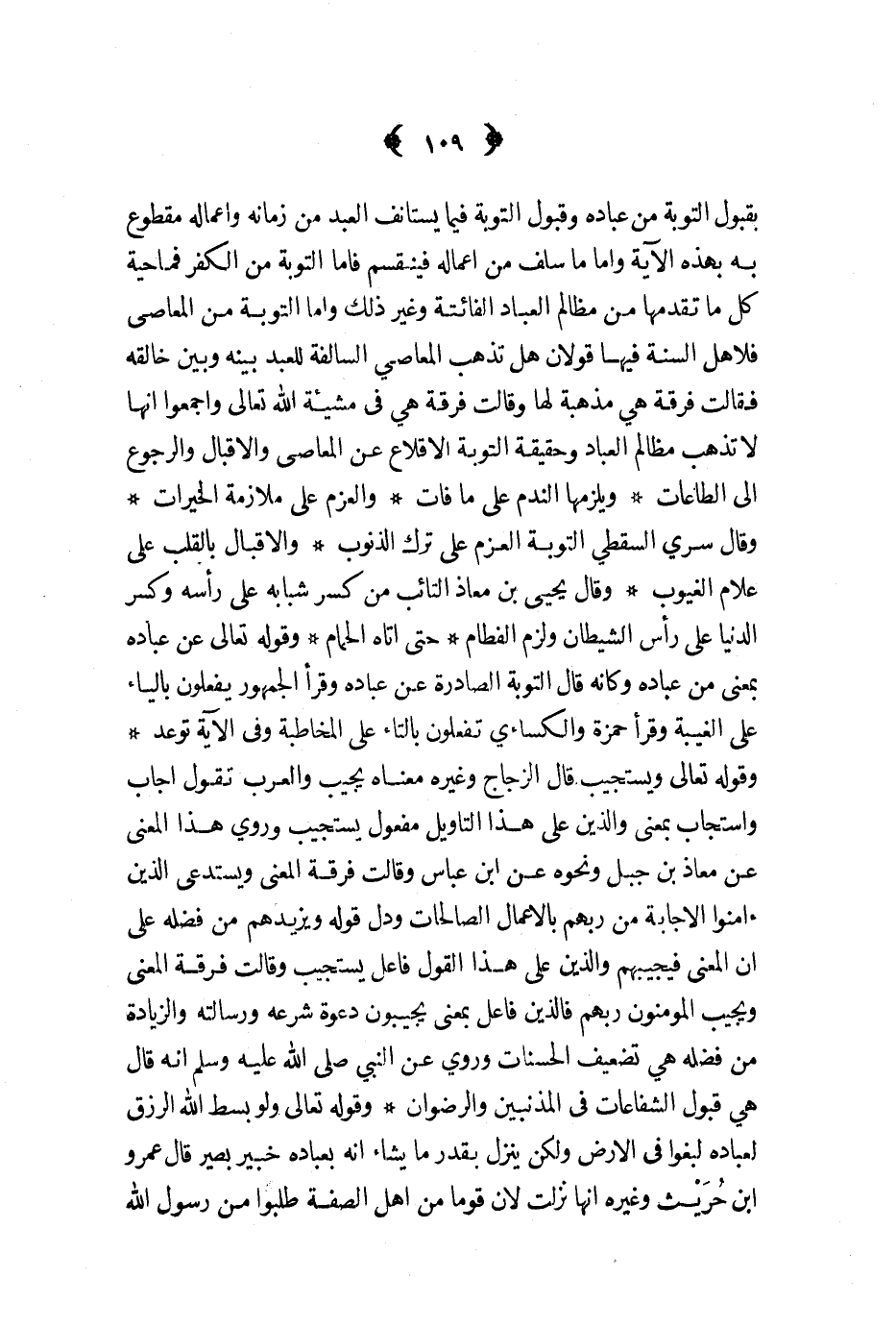 بقبول التوبة من عباده وقبول التوبة فيما يستأنف العبد من زمانه وأعماله مقطوع به بهذه الآية وأما ما سلف من أعماله فينقسم فأما التوية من الكفر فماحية كل ما تقدمها من مظالم العباد الفائتة وغير ذلك وأما التوبة من المعاصي فلأهل السنة فيها قولان هل تذهب المعاصي السالفة للعبد بينه وبين خالقه فقالت فرقة هي مذهبة لها وقالت فرقة هي في مشيئة الله تعالى وأجمعوا أنها لا تذهب مظالم العباد وحقيقة التوبة الاقلاع عن المعاصي والاقبال والرجوع الى الطاعات ويلزمها الندم على ما فات والعزم على ملازمة الخيرات وقال سري السقطي التوبة العزم على ترك الذنوب والاقبال بالقلب على علام الغيوب وقال يحيى بن معاذ التائب من كسر شبابه على رأسه وكسر الدنيا على راس الشيطان ولزم الفطام حتى أتاه الحمام وقوله تعالى عن عباده بمعنى من عباده وكأنه قال التوبة الصادرة عن عباده وقرأ الجمهور يفعلون بالياء على الغيبة وقرأ حمزة والكسائي تفعلون بالتاء على المخاطبة وفي الآية توعد وقوله تعالى ويستجيب قال الزجاج وغيره معناه يجيب والعرب تقول اجاب واستجاب بمعنى والذين على هذا التأويل مفعول يستجيب وروي هذا المعنى عن معاذ بن جبل ونحوه عن ابن عباس وقالت فرقة المعنى ويستدعي الذين آمنوا الاجابة من ربهم بالأعمال الصالحات ودل قوله ويزيدهم من فضله على أن المعنى فيجيبهم والذين على هذا القول فاعل يستجيب وقالت فرقة المعنى ويجيب المؤمنون ربهم فالذين فاعل بمعنى يجيبون دعوة شرعه ورسالته والزيادة من فضله هي تضعيف الحسنات وروي عن النبي صلى الله عليه و سلم أنه قال هي قبول الشفاعات في المذنبين والرضوان وقوله تعالى ولو بسط الله الرزق لعباده لبغوا في الأرض ولكن ينزل بقدر ما يشاء أنه بعباده خبير بصير قال عمرو ابن حريث وغيره أنها نزلت لأن قوما من أهل الصفة طلبوا من رسول الله
