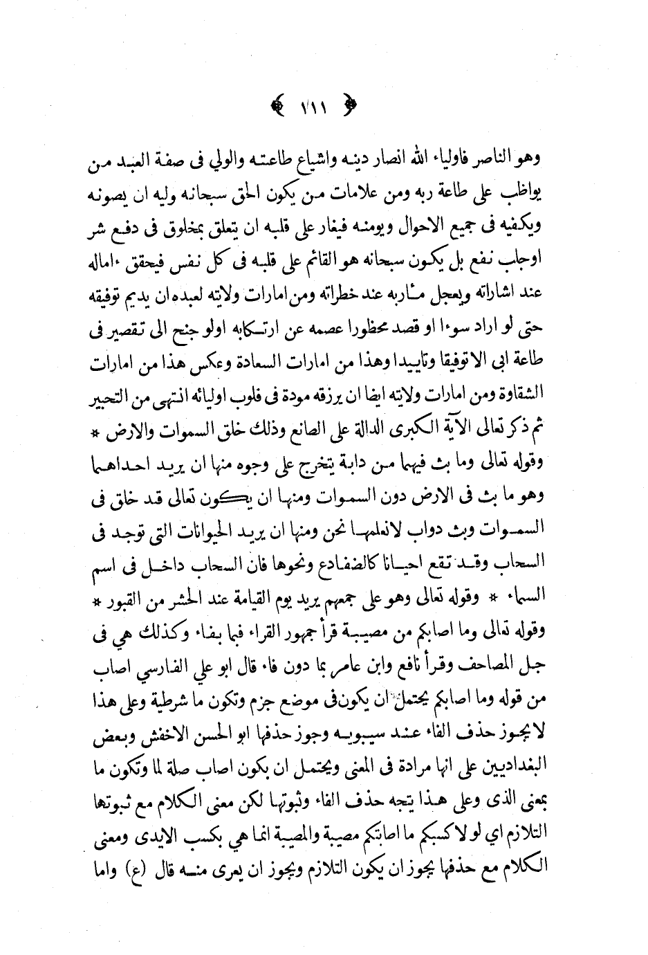وهو الناصر فأولياء الله أنصار دينه وأشياع طاعته والوالي في صفة العبد من يواظب على طاعة ربه ومن علامات من يكون الحق سبحانه وليه أن يصونه ويكفيه في جميع الأحوال ويؤمنه فيغار على قلبه أن يتعلق بمخلوق في دفع شر أو جلب نفع بل يكون سبحانه هو القائم على قلبه في كل نفس فيحقق آماله عند اشاراته ويعجل مآربه عند خطراته ومن أمارات ولايته لعبده أن يديم توفيقه حتى لو أراد سوءا أو قصد محظورا عصمه عن ارتكابه أولوا جنح الى تقصير في طاعة أبى الا توفيقا وتأييدا وهذا من أمارت السعادة وعكس هذا من إمارت الشقاوة ومن أمارات ولايته أيضا أن يرزقه مودة في قلوب أوليائه انتهى من التحبير ثم ذكر تعالى الآية الكبرى الدالة على الصانع وذلك خلق السماوات والأرض وقوله تعالى وما بث فيهما من دابة يتخرج على وجوه منها أن يريد أحدهما وهو ما بث في الأرض دون السموات ومنها أن يكون تعالى قد خلق في السماوات وبث دواب لا نعلمها نحن ومنها أن يريد الحيوانات التي توجد في السحاب وقد تقع أحيانا كالضفادع ونحوها فان السحاب داخل في اسم السماء وقوله تعالى وهو على جمعهم يريد يوم القيامة عند الحشر من القبور وقوله تعالى وما اصابكم من مصيبة قرأ جمهور القراء فبما بفاء وكذلك هي في جل المصاحف وقرأ نافع وابن عامر بما دون فاء قال أبو علي الفارسي أصاب من قوله وما أصابكم يحتمل أن يكون في موضع جزم وتكون ما شرطية وعلى هذا لا يجوز حذف الفاء عند سيبويه وجوز حذفها ابو الحسن الأخفش وبعض البغداديين على أنها مرادة في المعنى ويحتمل أن يكون أصاب صلة لما وتكون ما بمعنى الذي وعلى هذا يتجه حذف الفاء وثبوتها لكن معنى الكلام مع ثبوتها التلازم أي لولا كسبكم ما أصابتكم مصيبة والمصيبة انما هي بكسب الأيدي ومعنى الكلام مع حذفها يجوز أن يكون التلازم ويجوز أن يعرى منه قال ع وأما