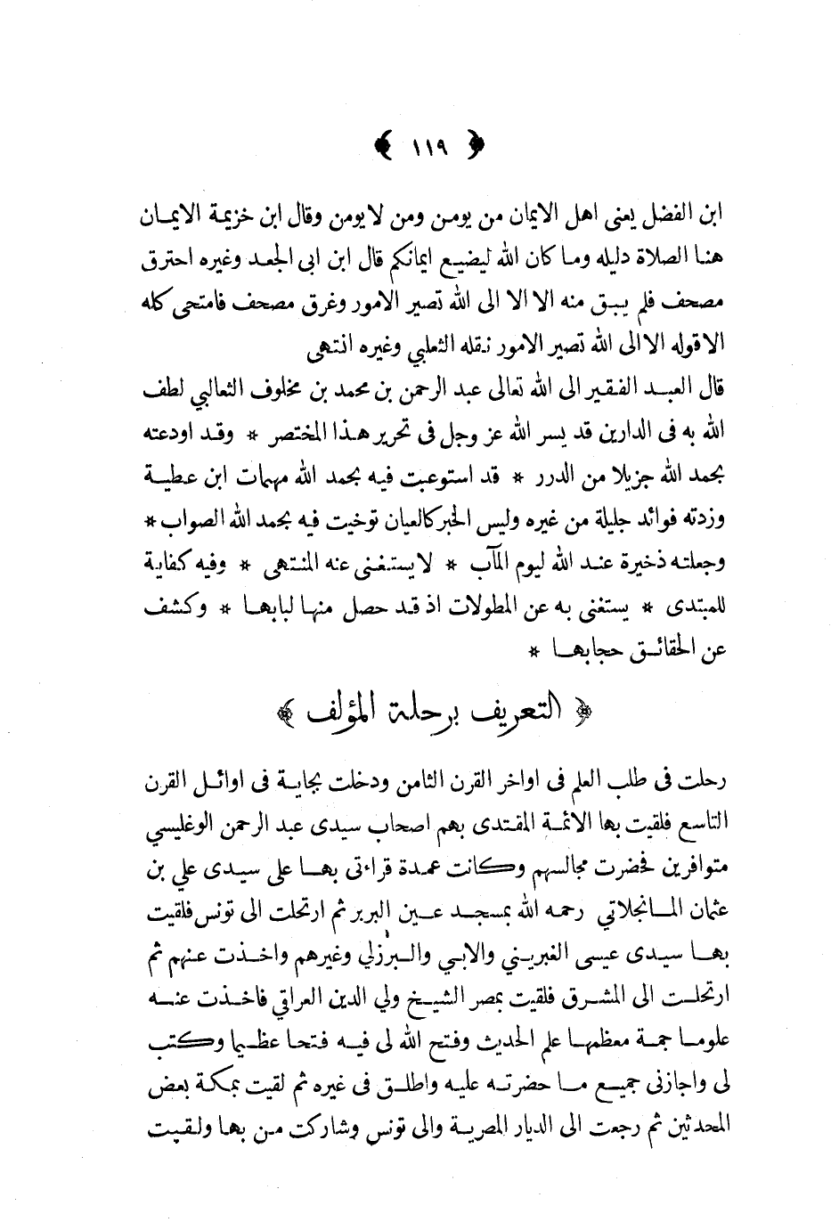 قال العبد الفقير الى الله تعالى عبد الرحمن بن محمد بن مخلوف الثعالبي لطف الله به في الدارين قد يسر الله عز و جل في تحرير هذا المختصر وقد أودعته بحمد الله جزيلا من الدرر قد استوعبت فيه بحمد الله مهمات ابن عطية وزدته فوائد جليلة من غيره وليس الخبر كالعيان توخيت فيه بحمد الله الصواب وجعلته ذخيرة عند الله ليوم المآب لا يستغني عنه المنتهي وفيه كفاية للمبتدي يستغني به عن المطولات اذ قد حصل منها لبابها وكشف عن الحقائق حجابها