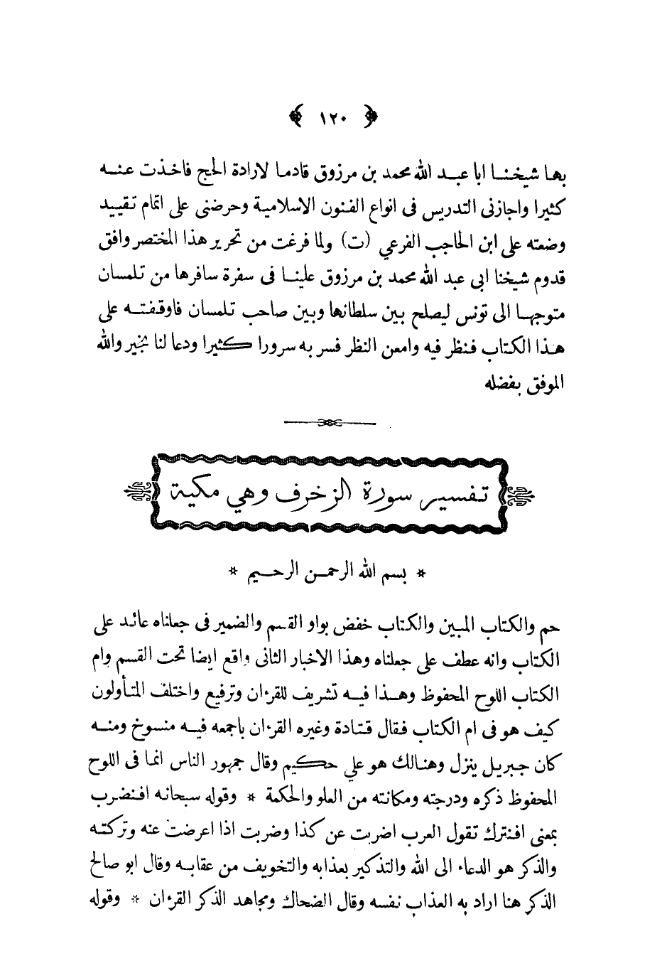 بها شيخنا أبا عبد الله محمد بن مرزوق قادما لارادة الحج فأخذت عنه كثيرا وأجازني التدريس في أنواع الفنون الاسلامية وحرضني على اتمام تقييد وضعته على ابن الحاجب الفرعي ت ولما فرغت من تحرير هذا المختصر وافق قدوم شيخنا أبي عبد الله محمد بن مرزوق علينا في سفرة سافرها من تلمسان متوجها الى تونس ليصلح بين سلطانها وبين صاحب تلمسان فأوقفته على هذا الكتاب فنظر فيه وأمعن النظر فسر به سرورا كثيرا ودعا لنا بخير والله الموفق بفضله