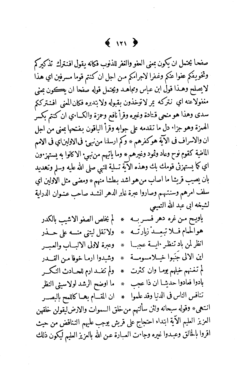 صفحا يحتمل أن يكون بمعنى العفو والغفر للذنوب فكأنه يقول أفنترك تذكيركم وتخويفكم عفوا عنكم وغفرا لاجرامكم من أجل إن كنتم قوما مسرفين أي هذا لا يصلح وهذا قول ابن عباس ومجاهد ويحتمل قوله صفحا أن يكون بمعنى مغفولا عنه أي نتركه يمر لا تؤخذون بقبوله ولا بتدبره فكان المعنى أفنترككم سدى وهذا هو منحى قتادى وغيره وقرأ نافع وحمزة والكسائي ان كنتم بكسر الهمزة وهو جزاء دل ما تقدمه على جوابه وقرأ الباقون بفتحها بمعنى من أجل أن والاسراف في الآية هو كفرهم وكم أرسلنا من نبي في الأولين أي في الأمم الماضية كقوم نوح وعاد وثمود وغيرهم وما يأتيهم من نبي الا كانوا به يستهزئون أي كما يستهزئ قومك بك وهذه الآية تسلية للنبي صلى الله عليه و سلم وتهديد بأن يصيب قريشا ما أصاب من هو أشد بطشا منهم ومضى مثل الأولين أي سلف أمرهم وسنتهم وصاروا عبرة غابر الدهر أنشد صاحب عنوان الدراية لشيخه أبي عبد الله التميمي ... يا ويح من غره دهر فسر به ... لم يخلص الصفو الا شيب بالكدر ... هو الحمام فلا تبعد زيارته ... ولا تقل ليتني منه على حذر ... انظر لمن باد تنظر آية عجبا ... وعبرة لأولي الألباب والعبر ... أين الألى جنبوا خيلا مسومة ... وشيدوا أرما خوفا من القدر ... لم تغنهم خيلهم يوما وإن كثرت ... ولم تفد أرم للحادث النكر ... بادوا فعادوا حديثا ان ذا عجب ... ما أوضح الرشد لولا سيء النظر ... تنافس الناس في الدنيا وقد علموا ... أن المقام بها كاللمح بالبصر ... انتهى وقوله سبحانه ولئن سألتهم من خلق السماوات والأرض ليقولن خلقهن العزيز العليم الآية ابتداء احتجاج على قريش يوجب عليهم التناقض من حيث اقروا بالخالق وعبدوا غيره وجاءت العبارة عن الله بالعزيز العليم ليكون ذلك