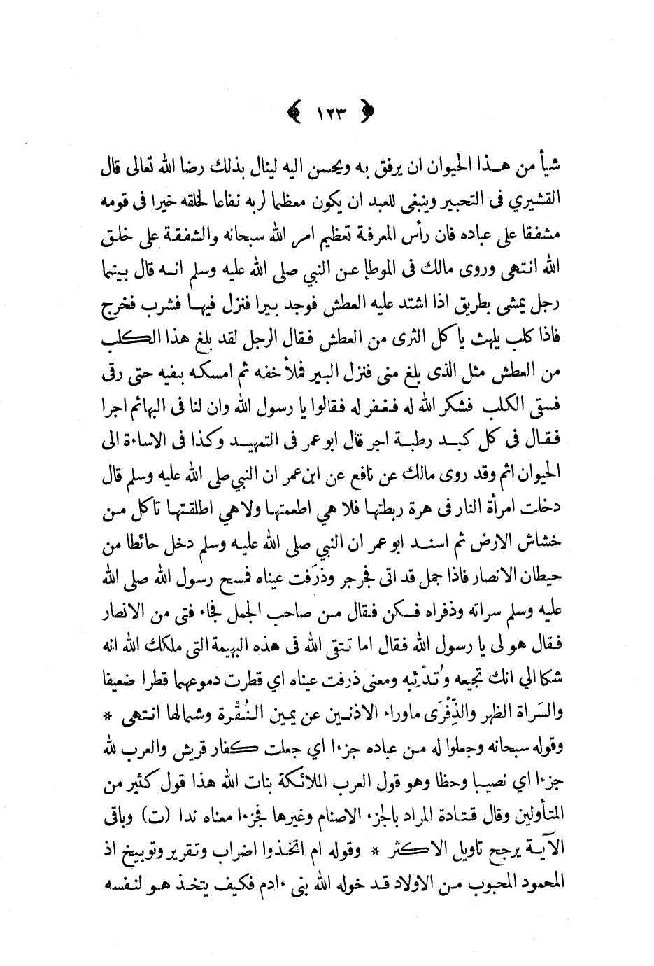 شيئا من هذا الحيوان أن يرفق به ويحسن اليه لينال بذلك رضا الله تعالى قال القشيري في التحبير وينبغي للعبد أن يكون معظما لربه نفاعا لخلقه خيرا في قومه مشفقا على عباده فان رأس المعرفة تعظيم أمر الله سبحانه والشفقة على خلق الله انتهى وروى مالك في الموطأ عن النبي صلى الله عليه و سلم أنه قال بينما رجل يمشي بطريق اذا اشتد عليه العطش فوجد بيرا فنزل فيها فشرب فخرج فاذا كلب يلهث يأكل الثرى من العطش فقال الرجل لقد بلغ هذا الكلب من العطش مثل الذي بلغ مني فنزل البير فملأ خفه ثم أمسكه بفيه حتى رقي فسقي الكلب فشكر الله له فغفر له فقالوا يا رسول الله وان لنا في البهائم أجرا فقال في كل كبد رطبة أجر قال أبو عمر في التمهيد وكذا في الاساءة الى الحيوان اثم وقد روى مالك عن نافع عن ابن عمر أن النبي صلى الله عليه و سلم قال دخلت امرأة النار في هرة ربطتها فلا هي أطعمتها ولا هي أطلقتها تأكل من خشاش الأرض ثم أسند أبو عمر أن النبي صلى الله عليه و سلم دخل حائطا من حيطان الأنصار فاذا جمل قد أتى فجرجر وذرفت عيناه فمسح رسول الله صلى الله عليه و سلم سراته وذفراه فسكن فقال من صاحب الجمل فجاء فتى من الأنصار فقال هو لي يا رسول الله فقال أما تتقي الله في هذه البهيمة التي ملكك الله أنه شكا الي أنك تجيعه وتدئبه ومعنى ذرفت عيناه أي قطرت دموعهما قطرا ضعيفا والسراة الظهر والذفرى ما وراء الاذنين عن يمين النقرة وشمالها انتهى وقوله سبحانه وجعلوا له من عباده جزاء أي جعلت كفار قريش والعرب لله جزاء أي نصيبا وحظا وهو قول العرب الملائكة بنات الله هذا قول كثير من المتأولين وقال قتادة المراد بالجزء الاصنام وغيرها فجزءا معناه ندا ت وباقي الآية يرجح تأويل الأكثر وقوله أم اتخذوا اضراب وتقرير وتوبيخ اذ المحمود المحبوب من الاولاد قد خوله الله بني آدم فكيف يتخذ هو لنفسه