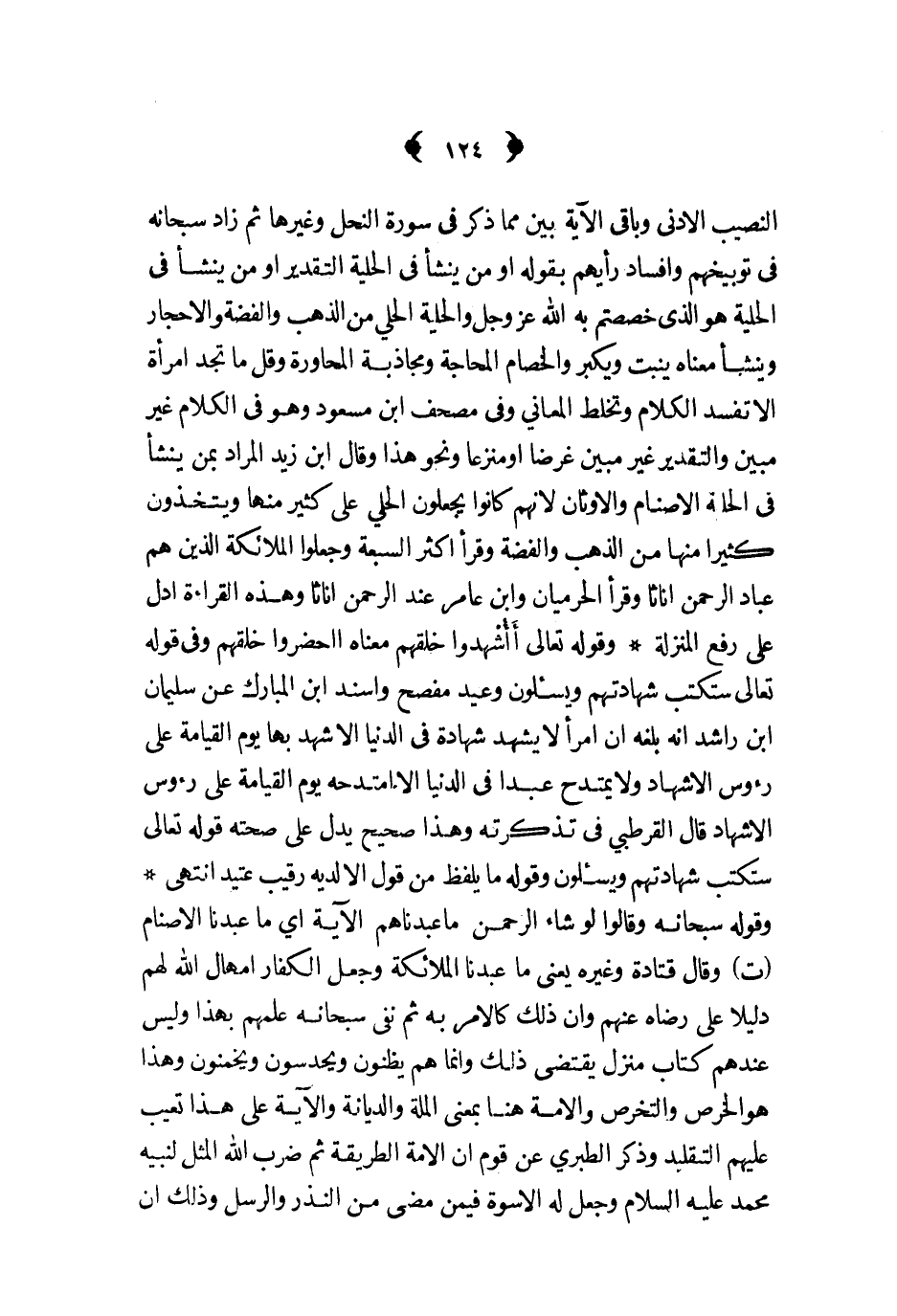النصيب الادنى وباقي الآية بين ما ذكر في سورة النحل وغيرها ثم زاد سبحانه في توبيخهم وافساد رأيهم بقوله أو من ينشأ في الحلية التقدير أو من ينشأ في الحلية هو الذي يختصم به الله عز و جل والحلية من الذهب والفضة والاحجار وينشأ معناه ينبت ويكبر والخصام المحاجة ومجاذبة المحاورة وقل ما تجد امرأة الا تفسد الكلام وتخلط المعاني وفي مصحف ابن مسعود وهو في الكلام غير مبين والتقدير غير مبين غرضا أو منزعا ونحو هذا وقال ابن زيد المراد بمن ينشأ في الحلبة الاصنام والأوثان لأنهم كانوا يجعلون الحلي على كثير منها ويتخذون كثيرا منها من الذهب والفضة وقرأ أكثر السبعة وجعلوا الملائكة الذين هم عباد الرحمن اناثا وقرأ الحرميان وابن عامر عند الرحمن اناثا وهذه القراءة أدل على رفع المنزلة وقوله تعالى أأشهدوا خلقهم معناه أأحضروا خلقهم وفي قوله تعالى ستكتب شهادتهم ويسئلون وعيد مفصح واسند ابن المبارك عن سليمان ابن راشد أنه بلغه أن امرا لا يشهد شهادة في الدنيا الا شهد بها يوم القيامة على رؤوس الاشهاد ولا يمتدح عبدا في الدنيا الا امتدحه يوم القيامة على رؤوس الاشهاد قال القرطبي في تذكرته وهذا صحيح يدل على صحته قوله تعالى ستكتب شهادتهم ويسئلون وقوله ما يلفظ من قول الا لديه رقيب عتيد انتهى وقوله سبحانه وقالوا لو شاء الرحمن ما عبدناهم الآية أي ما عبدنا الأصنام ت وقال قتادة وغيره يعني ما عبدنا الملائكة وجعل الكفار أمهال الله لهم دليلا على رضاه عنهم وان ذلك كالأمر به ثم نفى سبحانه علمهم بهذا وليس عندهم كتاب منزل يقتضي ذلك وانما هم يظنون ويحدسون ويخمنون وهذا هو الخرص والتخرص والامة هنا بمعنى الملة والديانة والآية على هذا تعيب عليهم التقليد وذكر الطبري عن قوم أن الأمة الطريقة ثم ضرب الله المثل لنبيه محمد عليه السلام وجعل له الأسوة فيمن مضى من النذر والرسل وذلك أن