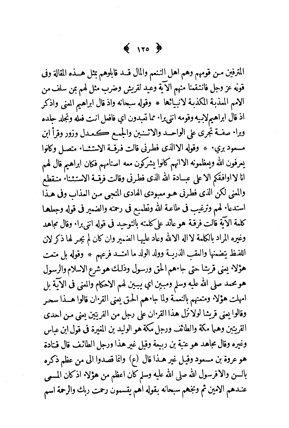المترفين من قومهم وهم أهل التنعم والمال قد قابلوهم بمثل هذه المقالة وفي قوله عز و جل فانتقمنا منهم الآية وعيد لقريش وضرب مثل لهم بمن سلف من الأمم المعذبة المكذبة لأنبيائها وقوله سبحانه واذ قال ابراهيم المعنى واذكر اذ قال ابراهيم لأبيه وقومه أنني براء مما تعبدون أي فافعل أنت فعله وتجلد جلده وبراء صفة تجري على الواحد والاثنين والجمع كعدل وزور وقرأ ابن مسعود بريء وقوله الا الذي فطرني قالت فرقة الاستثناء متصل وكانوا يعرفون الله ويعظمونه الا انهم كانوا يشركون معه اصنامهم فكان ابراهيم قال لهم انا لا أوافقكم الا على عبادة الله الذي فطرني وقالت فرقة الاستثناء منقطع والمعنى لكن الذي فطرني هو معبودي الهادي المنجي من العذاب وفي هذا استدعاء لهم وترغيب في طاعة الله وتطميع في رحمته والضمير في قوله وجعلها كلمة الآية قالت فرقة هو عائد على كلمته بالتوحيد في قوله انني براء وقال مجاهد وغيره المراد بالكلمة لا اله الا الله وعاد عليها الضمير وان كان لم يجر لها ذكران اللفظ يتضمنها والعقب الذرية وولد الولد ما امتد فرعهم وقوله بل متعت هؤلاء يعني قريشا حتى جاءهم الحق ورسول وذلك هو شرع الاسلام والرسول هو محمد صلى الله عليه و سلم ومبين أي يبين لهم الاحكام والمعنى في الآية بل أمهلت هؤلاء ومتعتهم بالنعمة ولما جاءهم الحق يعني القرآن قالوا هذا سحر وقالوا يعني قريشا لولا نزل هذا القرآن على رجل من القريتين يعني من إحدى القريتين وهما مكة والطائف ورجل مكة هو الوليد بن المغيرة في قول ابن عباس وغيره وقال مجاهد هو عتبة بن ربيعة وقيل غير هذا ورجل الطائف قال قتادة هو عروة بن مسعود وقيل غير هذا قال ع وانما قصدوا الى من عظم ذكره بالسن والا فرسول الله صلى الله عليه و سلم كان أعظم من هؤلاء اذ كان المسمى عندهم الأمين ثم وبخهم سبحانه بقوله أهم يقسمون رحمة ربك والرحمة اسم