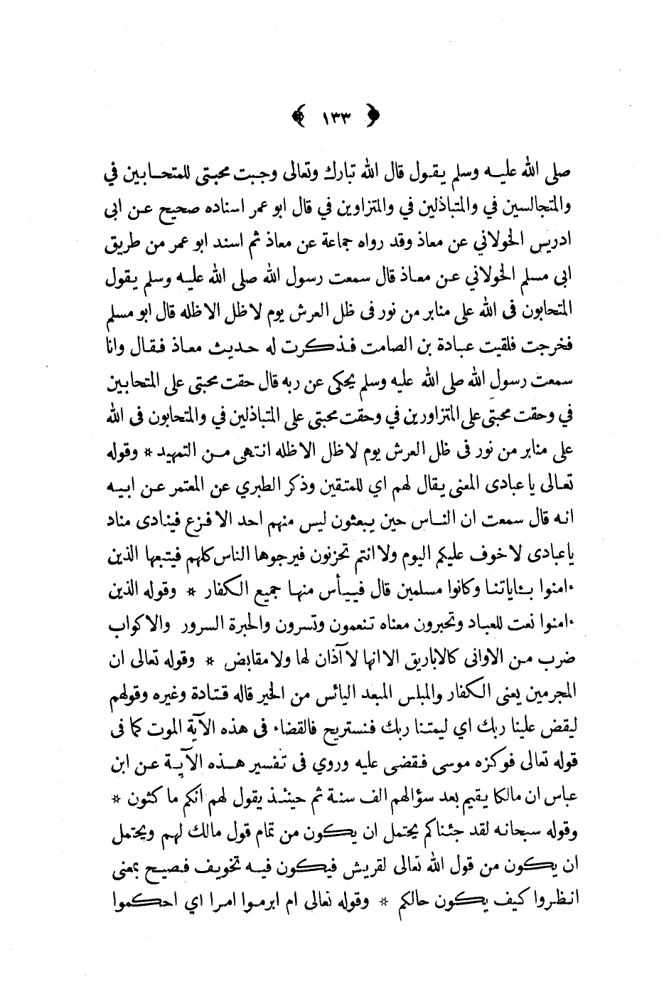 ص - يقول قال الله تبارك وتعالى وجبت محبتي للمتحابين في والمتجالسين في والمتباذلين في والمتزاورين في قال أبو عمر اسناده صحيح عن أبي ادريس الخولاني عن معاذ وقد رواه جماعة عن معاذ ثم اسند أبو عمر من طريق ابي مسلم الخولاني عن معاذ قال سمعت رسول الله ص - يقول المتحابون في الله على منابر من نور في ظل العرش يوم لا ظل إلا ظله قال أبو مسلم فخرجت فلقيت عبادة بن الصامت فذكرت له حديث معاذ فقال وانا سمعت رسول الله ص - يحكي عن ربه قال حقت محبتي على المتحابين في وحقت محبتي على المتزاورين في وحقت محبتي على المتباذلين في والمتحابون في الله على منابر من نور في ظل العرش يوم لا ظل إلا ظله انتهى من التمهيد وقوله تعالى يا عبادي المعني يقال لهم أي للمتقين وذكر الطبري عن المعتمر عن ابيه انه قال سمعت ان الناس حين يبعثون ليس منهم احد إله فزع فينادي مناد يا عبادي لا خوف عليكم اليوم ولا انتم تحزنون فيرجوها الناس كلهم فيتبعها الذين آمنوا بآياتنا وكانوا مسلمين قال فييأس منها جميع الكفار وقوله الذين امنوا نعت للعباد وتحبرون معناه تنعمون وتسرون والحبرة السرور والاكواب ضرب من الاواني كالاباريق الا انها لا آذان لها ولا مقابض وقوله تعالى ان المجرمين يعني الكفار والمبلس المبعد اليائس من الخير قاله قتادة وغيره وقولهم ليقض علينا ربك أي ليمتنا ربك فنستريح فالقضاء في هذه الآية الموت كما في قوله تعالى فوكزه موسى فقضى عليه وروي في تفسير هذه الآية عن ابن عباس أن مالكا يقيم بعد سؤالهم الف سنة ثم حينئذ يقول لهم انكم ماكثون وقوله سبحانه لقد جئناكم يحتمل أن يكون من تمام قول مالك لهم ويحتمل ان يكون من قول الله تعالى لقريش فيكون فيه تخويف فصيح بمعنى انظروا كيف يكون حالكم وقوله تعالى ام ابرموا امرا أي احكموا