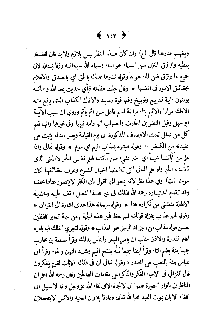 ويفهم قدرها قال ع وان كان هذا النظر ليس بلازم ولا بد فان اللفظ يعطيه والرزق المنزل من السماء هو الماء وسماه الله سبحانه رزقا بمئاله لان جميع ما يرتزق فعن الماء هو وقوله نتلوها عليك بالحق أي بالصدق والاعلام بحقائق الامور في انفسها وقال جلت عظمته فبأي حديث بعد الله وأياته يومنون ءاية تقريع وتوبيخ وفيها قوة تهديد والافاك الكذاب الذي يقع منه الافك مرارا والاثيم بناء مبالغة اسم فاعل من اثم ياثم وروي ان سبب الآية ابو جهل وقيل النضر بن الحارث والصواب انها عامة فيهما وفي غيرهما وانها تعم كل من دخل تحت الاوصاف المذكورة الى يوم القيامة ويصر معناه يثبت على عقيدته من الكفر وقوله فبشره بعذاب اليم أي مؤلم وقوله تعالى وإذا علم من آياتنا شيأ أي اخبر بشيء من آياتنا فعلم نفس الخبر لا المعنى الذي تضمنه الخبر ولو علم المعاني التي تضمنها اخبار الشرع وعرف حقائقها لكان مومنا ت وفي هذا نظر لأنه ينحو الى القول بان الكفر لا يتصور عنادا محضا وقد تقدم اختياره رحمه الله لذلك في غير هذا المحل فقف عليه وخشية الاطالة منعتني من تكراره هنا وقوله سبحانه هذا هدى اشارة الى القرآن وقوله لهم عذاب بمنزلة قولك لهم حظ فمن هذه الجهة ومن جهة تغاير اللفظين حسن قوله عذاب من رجز اذ الرجز هو العذاب وقوله لتجري الفلك فيه بأمره أقام القدرة والاذن مناب أن يأمر البحر والناس بذلك وقرأ مسلمة بن محارب جميعا منة بضم التاء وقرأ ايضا جميعا منه بفتح الميم وشد النون والهاء وقرأ ابن عباس منة بالنصب على المصدر وقوله تعالى ان في ذلك لآيات لقوم يتفكرون قال الغزالي في الاحياء الفكر والذكر اعلى مقامات الصالحين وقال رحمه الله اعلم ان الناظرين بأنوار البصيرة علموا ان لا نجاة الا في لقاء الله عز و جل وانه لا سبيل الى اللقاء الا بان يموت العبد محبا لله تعالى وعارفا به وان المحبة والانس لا يتحصلان