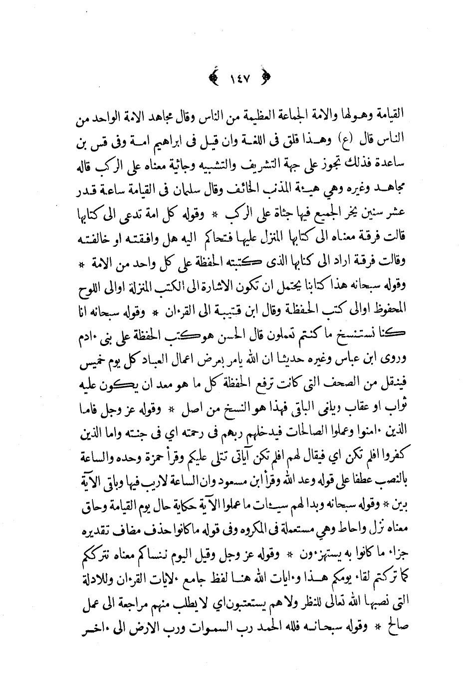 القيامة وهولها والامة الجماعة العظيمة من الناس وقال مجاهد الامة الواحد من الناس قال ع وهذا قلق في اللغة وان قيل في ابراهيم امة وفي قس بن ساعدة فذلك تجوز على جهة التشريف والتشبيه وجاثية معناه على الركب قاله مجاهد وغيره وهي هيئة المذنب الخائف وقال سلمان في القيامة ساعة قدر عشر سنين يخر الجميع فيها جثاة على الركب وقوله كل امة تدعى الى كتابها قالت فرقة معناه الى كتابها المنزل عليها فتحاكم اليه هل وافقته او خالفته وقالت فرقة اراد الى كتابها الذي كتبته الحفظة على كل واحد من الامة وقوله سبحانه هذا كتابنا يحتمل ان تكون الاشارة الى الكتب المنزلة أو الى اللوح المحفوظ او الى كتب الحفظة وقال ابن قتيبة الى القرآن وقوله سبحانه انا كنا نستنسخ ما كنتم تعملون قال الحسن وهو كتب الحفظة على بني أدم وروى ابن عباس وغيره حديثا ان الله يأمر بعرض اعمال العباد كل يوم خميس فينقل من الصحف التي كانت ترفع الحفظة كل ما هو معد ان يكون عليه ثواب او عقاب ويلغى الباقي فهذا هو النسخ من أصل وقوله عز و جل فاما الذين أمنوا وعملوا الصالحات فيدخلهم ربهم في رحمته أي في جنته واما الذين كفروا أفلم تكن أي فيقال لهم افلم تكن آياتي تتلى عليكم وقرأ حمزه وحده والساعة بالنصب عطفا على قوله وعد الله وقرأ ابن مسعود وان الساعة لا ريب فيها وباقي الآية بين وقوله سبحانه وبدا لهم سيئات ما عملوا الآية حكاية حال يوم القيامة وحاق معناه نزل واحاط وهي مستعملة في المكروه وفي قوله ما كانوا حذف مضاف تقديره جزاء ما كانوا به يستهزءون وقوله عز و جل وقيل اليوم ننساكم معناه نترككم كما تركتم لقاء يومكم هذا وأيات الله هنا لفظ جامع لآيات القرآن وللأدلة التي نصبها الله تعالى للنظر ولا هم يسيتعتبون أي لا يطلب منهم مراجعة إلى عمل صالح وقوله سبحانه فلله الحمد رب السموات ورب الارض الى آخر