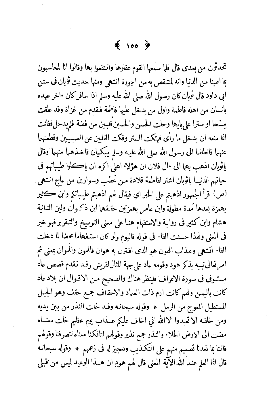 تحدثون من بعدي قال فلما سمعها القوم عقلوها وانتفعوا بها وقالوا انا لمحاسبون بما اصبنا من الدنيا وانه لمنتقص به من اجورنا انتهى ومنها حديث ثوبان في سنن ابي داود قال ثوبان كان رسول الله ص - اذا سافر كان آخر عهده بانسان من اهله فاطمة واول من يدخل عليها فاطمة فقدم من غزاة وقد علقت مسحا او سترا على بابها وحلت الحسن والحسين قلبين من فضة فلم يدخل فظنت انما منعه ان يدخل ما رأى فهتكت الستر وفكت القلبين عن الصلبيين وقطعتهما عنهما فانطلقا الى رسول الله ص - يبكيان فاخذهما منهما وقال يا ثوبان اذهب بهما الى آل فلان ان هؤلاء اهلي اكره ان ياكلوا طيباتهم في حياتهم الدنيا يا ثوبان اشتر لفاطمة قلادة من عصب وسوارين من عاج انتهى ص قرأ الجمهور اذهبتم على الخبر أي فيقال لهم اذهبتم طيباتكم وابن كثير بهمزة بعدها مدة مطولة وابن عامر بهمزتين حققهما ابن ذكوان ولين الثانية هشام وابن كثير في رواية والاستفهام هنا على معنى التوبيخ والتقرير فهو خبر في المعنى ولهذا حسنت الفاء في قوله فاليوم ولو كان استفهاما محضا لما دخلت الفاء انتهى وعذاب الهون هو الذي اقترن به هوان فالهون والهوان بمعنى ثم امر تعالى نبيه بذكر هود وقومه عاد على جهة المثال لقريش وقد تقدم قصص عاد مستوفى في سورة الأعراف فلينظر هناك والصحيح من الأقوال ان بلاد عاد كانت باليمن ولهم كانت ارم ذات العماد والأحقاف جمع حقف وهو الجبل المستطيل المعوج من الرمل وقوله سبحانه وقد خلت النذر من بين يديه ومن خلفه الا تعبدوا الا الله اني اخاف عليكم عذاب يوم عظيم خلت معناه مضت الى الأرض الخلاء والنذر جمع نذير وقولهم لتافكنا معناه لتصرفناوقولهم فاتنا بما تعدنا تصميم منهم على التكذيب وتعجيز له في زعمهم وقوله سبحانه قال انما العلم عند الله الآية المعنى قال لهم هود ان هذا الوعيد ليس من قبلي