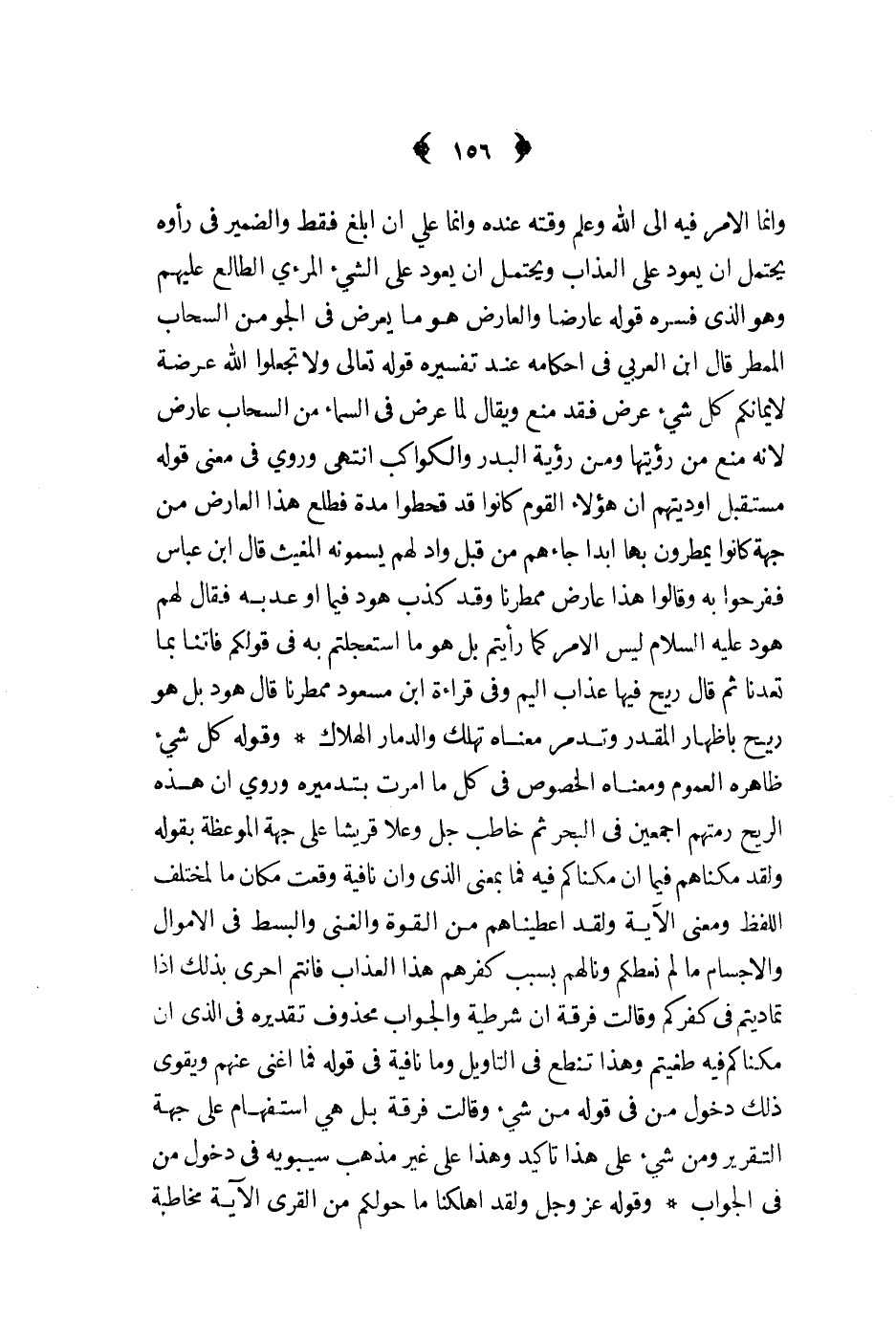 وانما الامر فيه الى الله وعلم وقته عنده وانما علي ان ابلغ فقط والضمير في رأوه يحتمل ان يعود على العذاب ويحتمل ان يعود على الشيء المرءي الطالع عليهم وهو الذي فسره قوله عارضا والعارض هو ما يعرض في الجو من السحاب الممطر قال ابن العربي في احكامه عند تفسيره قوله تعالى ولا تجعلوا الله عرضة لايمانكم كل شيء عرض فقد منع ويقال لما عرض في السماء من السحاب عارض لأنه منع من رؤيتها ومن رؤية البدر والكواكب انتهى وروي في معنى قوله مستقبل اوديتهم ان هؤلاء القوم كانوا قد قحطوا مدة فطلع هذ العارض من جهة كانوا يمطرون بها ابدا جاءهم من قبل واد لهم يسمونه المغيث قال ابن عباس ففرحوا به وقالوا هذا عارض ممطرنا وقد كذب هود فيما اوعد به فقال لهم هود عليه السلام ليس الأمر كما رأيتم بل هو ما استعجلتم به في قولكم فاتنا بما تعدنا ثم قال ريح فيها عذاب اليم وفي قراءة ابن مسعود ممطرنا قال هود بل هو ريح بإظهار المقدر وتدمر معناه تهلك والدمار الهلاك وقوله كل شيء ظاهره العموم ومعناه الخصوص في كل ما امرت بتدميره وروي ان هذه الريح رمتهم اجمعين في البحر ثم خاطب جل وعلا قريشا على جهة الموعظة بقوله ولقد مكناهم فيما ان مكناكم فيه فما بمعنى الذي وان نافية وقعت مكان ما لمختلف اللفظ ومعنى الآية ولقد اعطيناهم من القوة والغنى والبسط في الأموال والأجسام ما لم نعطكم ونالهم بسبب كفرهم هذا العذاب فانتم احرى بذلك اذا تماديتم في كفركم وقالت فرقة ان شرطية والجواب محذوف تقديره في الذي ان مكناكم فيه طغيتم وهذا تنطع في التاويل وما نافية في قوله فما اغنى عنهم ويقوى ذلك دخول من في قوله من شيء وقالت فرقة بل هي استفهام على جهة التقرير ومن شيء على هذا تاكيد وهذا على غير مذهب سيبويه في دخول من في الجواب وقوله عز و جل ولقد اهلكنا ما حولكم من القرى الآية مخاطبة