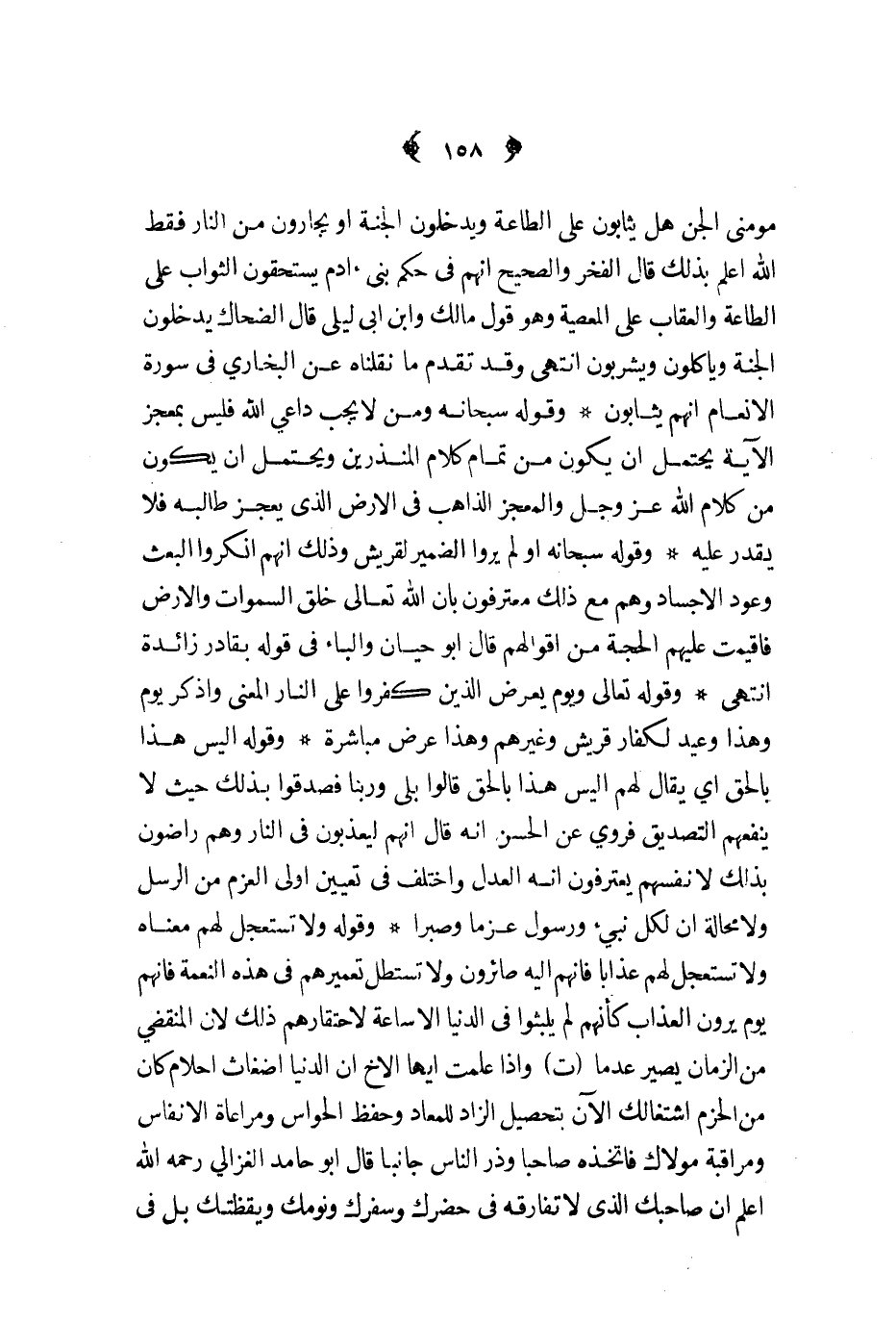 3 - ومني الجن هل يثابون على الطاعة ويدخلون الجنة او يجارون من النار فقط الله اعلم بذلك قال الفخر والصحيح انهم في حكم بني آدم يستحقون الثواب على الطاعة والعقاب على المعصية وهو قول مالك وابن ابي ليلى قال الضحاك يدخلون الجنة ويأكلون ويشربون انتهى وقد تقدم ما نقلناه عن البخاري في سورة الأنعام انهم يثابون وقوله سبحانه ومن لا يجب داعي الله فليس بمعجز الآية يحتمل ان يكون من تمام كلام المنذرين ويحتمل ان يكون من كلام الله عز و جل والمعجز الذاهب في الأرض الذي يعجز طالبه فلا يقدر عليه وقوله سبحانه اولم يروا الضمير لقريش وذلك انهم انكروا البعث وعود الاجساد وهم مع ذلك معترفون بان الله تعالى خلق السموات والارض فاقيمت عليهم الحجة من اقوالهم قال ابو حيان والباء في قوله بقادر زائدة انتهى وقوله تعالى ويوم يعرض الذين كفروا على النار المعنى واذكر يوم وهذا وعيد لكفار قريش وغيرهم وهذا عرض مباشرة وقوله اليس هذا بالحق أي يقال لهم اليس هذا بالحق قالوا بلى وربنا فصدقوا بذلك حيث لا ينفعهم التصديق فروي عن الحسن انه قال انهم ليعذبون في النار وهم راضون بذلك لأنفسهم يعترفون انه العدل واختلف في تعينن اولى العزم من الرسل ولا محالة ان لكل نبي ورسول عزما وصبرا وقوله ولا تستعجل لهم معناه ولا تستعجل لهم عذابا فانهم اليه صائرون ولا تستطل تعميرهم في هذه النعمة فانهم يوم يرون العذاب كانهم لم يلبثوا في الدنيا الا ساعة لاحتقارهم ذلك لان المنقضي من الزمان يصير عدما ت واذا علمت ايها الاخ ان الدنيا اضغاث احلام كان من الحزم اشتغالك الآن بتحصيل الزاد للمعاد وحفظ الحواس ومراعاة الانفاس ومراقبة مولاك فاتخذه صاحبا وذر الناس جانبا قال ابو حامد الغزالي رحمه الله اعلم ان صاحبك الذي لا تفارقه في حضرك وسفرك ونومك ويقظتك بل في