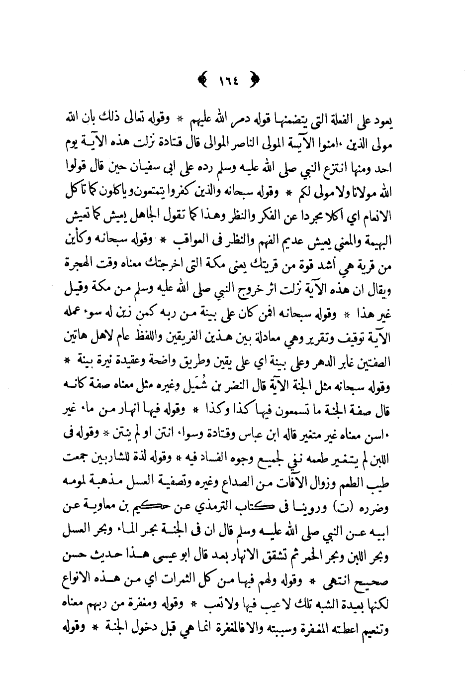 يعود على الفعلة التي يتضمنها قوله دمر الله عليهم وقوله تعالى ذلك بان الله مولى الذين أمنوا الآية المولى الناصر الموالي قال قتادة نزلت هذه الآية يوم احد ومنها انتزع النبي ص - رده على ابي سفيان حين قال قولوا الله مولانا ولا مولى لكم وقوله سبحانه والذين كفروا يتمتعون ويأكلون كما تأكل الأنعام أي اكلا مجردا عن الفكر والنظر وهذا كما تقول الجاهل يعيش كما تعيش البهيمة والمعنى يعيش عديم الفهم والنظر في العواقب وقوله سبحانه وكأين من قرية هي أشد قوة من قريتك يعني مكة التي اخرجتك معناه وقت الهجرة ويقال أن هذه الاية نزلت اثر خروج النبي ص - من مكة وقيل غير هذا وقوله سبحانه افمن كان على بينة من ربه كمن زين له سوء عمله الآية توقيف وتقرير وهي معادلة بين هذين الفريقين واللفظ عام لاهل هاتين الصفتين غابر الدهر وعلى بينة أي على يقين وطريق واضحة وعقيدة نيرة بينة وقوله سبحانه مثل الجنة الآية قال النضر بن شميل وغيره مثل معناه صفة كانه قال صفة الجنة ما تسمعون فيها كذا وكذا وقوله فيها انهار من ماء غير آسن معناه غير متغير قاله ابن عباس وقتادة وسواء انتن او ينتن وقوله في اللبن لم يتغير طعمه نفي لجميع وجوه الفساد فيه وقوله لذة للشاربين جمعت طيب الطعم وزوال الآفات من الصداع وغيره وتصفية العسل مذهبة لمومه وضرره ت وروينا في كتاب الترمذي عن حكيم بن معاوية عن ابيه عن النبي ص - قال ان في الجنة بحر الماء وبحر العسل وبحر اللبن وبحر الخمر ثم تشقق الانهار بعد قال ابو عيسى هذا حديث حسن صحيح انتهى وقوله ولهم فيها من كل الثمرات أي من هذه الأنواع لكنها بعيدة الشبه تلك لا عيب فيها ولا تعب وقوله ومغفرة من ربهم معناه وتنعيم اعطته المغفرة وسببته والا فالمغفرة انما هي قبل دخول الجنة وقوله