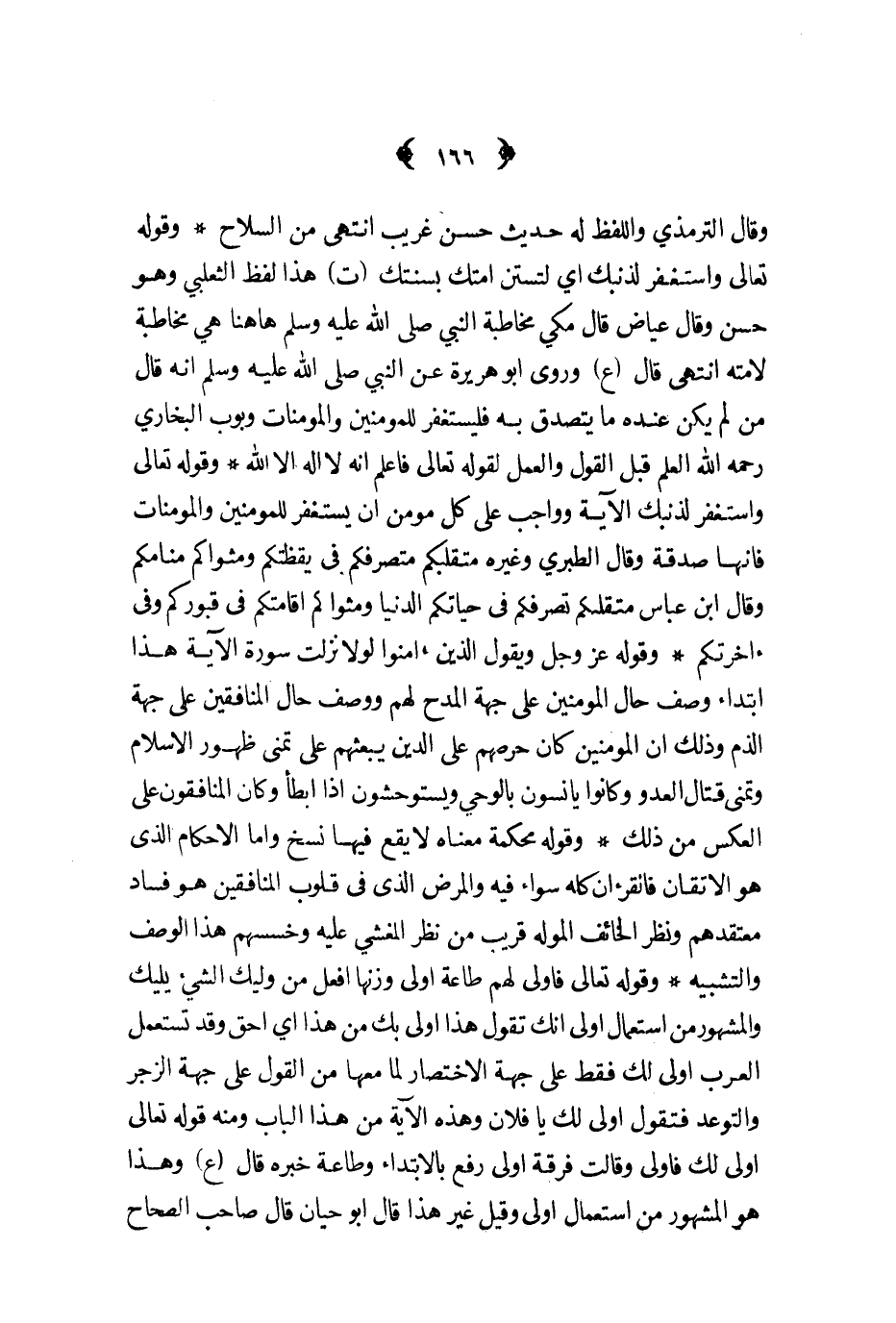 وقال الترمذي واللفظ له حديث حسن غريب انتهى من السلاح وقوله تعالى واستغفر لذنبك أي لتستن امتك بسنتك ت هذا لفظ الثعلبي وهو حسن وقال عياض قال مكي مخاطبة النبي ص - ها هنا هي مخاطبة لامته انتهى قال ع وروى ابو هريرة عن النبي ص - انه قال من لم يكن عنده ما يتصدق به فليستغفر للمؤمنين والمؤمنات وبوب البخاري رحمه الله العلم قبل القول والعمل لقوله تعالى فاعلم انه لا اله الا الله وقوله تعالى واستغفر لذنبك الآية وواجب على مومن ان يستغفر للمؤمنين والمؤمنات فانها صدقة وقال الطبري وغيره متقلبكم متصرفكم فى يقظتكم ومثواكم منامكم وقال ابن عباس متقلبكم تصرفكم في حياتكم الدنيا ومثواكم اقامتكم في قبوركم وفي أخرتكم وقوله عز و جل ويقول الذين أمنوا لولا نزلت سورة الآية هذا ابتداء وصف حال المؤمنين على جهة المدح له ووصف حال المنافقين على جهة الذم وذلك ان المؤمنين كان حرصهم على الدين يبعثهم على تمنى ظهور الاسلام وتمنى قتال العدو وكانوا يانسون بالوحي ويستوحشون اذا ابطأ وكان المنافقون على العكس من ذلك وقوله محكمة معناه لا يقع فيها نسخ واما الاحكام الذي هو الاتقان فالقرآن كله سواء فيه والمرض الذي في قلوب المنافقين هو فساد معتقدهم ونظر الخائف الموله قريب من نظر المغشي عليه وخسسهم هذا الوصف والتشبيه وقوله تعالى فاولى لهم طاعة اولى وزنها افعل من وليك الشيء يليك والمشهور من استعمال اولى انك تقول هذا اولى بك من هذا أي احق وقد تستعمل العرب اولى لك فقط على جهة الاختصار لما معها من القول على جهة الزجروالتوعد فتقول اولى لك يا فلان وهذه الآية من هذا الباب ومنه قوله تعالى اولى لك فأولى وقالت فرقة اولى رفع بالابتداء وطاعة خبره قال ع وهذا هو المشهور من استعمال اولى وقيل غير هذا قال ابو حيان قال صاحب الصحاح
