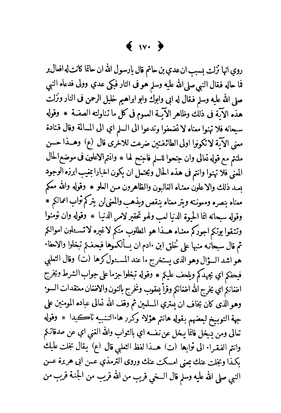 روي انها نزلت بسبب ان عدي بن حاتم قال يا رسول الله ان حاتما كانت له افعال بر فما حاله فقال النبي ص - هو في النار فبكى عدي وولى فدعاه النبي ص - فقال له ابي وابوك وابو ابراهيم خليل الرحمن في النار ونزلت هذه الآية في ذلك وظاهر الآية العموم في كل ما تناولته الصفة وقوله سبحانه فلا تهنوا معناه لا تضعفوا وتدعوا الى السلم أي الى المسألة وقال قتادة معنى الآية لا تكونوا اولى الطائفتين ضرعت للأخرى قال ع وهذا حسن ملتئم مع قوله تعالى وان جنحوا للسلم فاجنح لها وانتم الأعلون في موضع الحال المعنى فلا تهنوا وانتم في هذه الحال ويحتمل ان يكون اخبارا بمغيب ابرزه الوجود بعد ذلك والأعلون معناه الغالبون والظاهرون من العلو وقوله والله معكم معناه بنصره ومعونته ويتر معناه ينقص ويذهب والمعنى لن يتركم ثواب اعمالكم وقوله سبحانه انما الحياة الدنيا لعب ولهو تحقير لامر الدنيا وقوله وان تومنوا وتتقوا يؤتكم اجوركم معناه هذا هو المطلوب منكم لا غيره لا تسئلون اموالكم ثم قال سبحانه منبها على خلق ابن آدم ان يسألكموها فيحفكم تبخلوا والاحفاء هو اشد السؤال وهو الذي يستخرج ما عند المسئول كرها ت وقال الثعلبي فيحفكم أي يجهدكم ويلحف عليكم وقوله تبخلوا جزما على جواب الشرط ويخرج اضغانكم أي يخرج الله اضغانكم وقرأ يعقوب ونخرج بالنون والاضغان معتقدات السوء وهو الذي كان يخاف ان يعتري المسلمين ثم وقف الله تعالى عباده المؤمنين على جهة التوبيخ لبعضهم بقوله هأنتم هؤلاء وكرر ها التنبيه تاكيدا وقوله تعالى ومن يبخل فانما يبخل عن نفسه أي بالثواب والله الغني أي عن صدقاتكم وانتم الفقراء الى ثوابها ت هذا لفظ الثعلبي قال ع يقال بخلت عليك بكذا وبخلت عنك بمعنى امسكت عنك وروى الترمذي عن ابي هريرة عن النبي ص - قال السخي قريب من الله قريب من الجنة قريب من