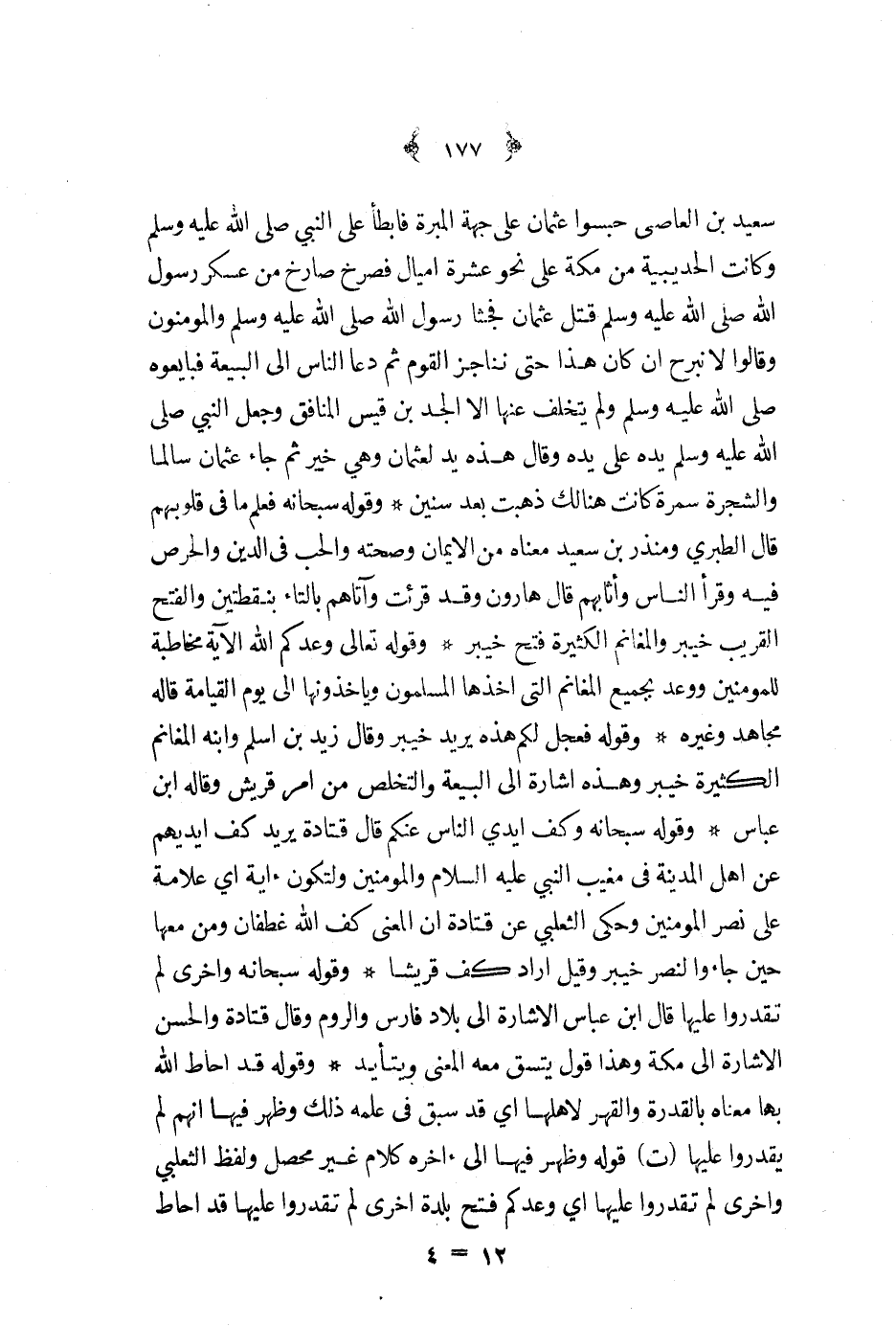 سعيد بن العاصي حبسوا عثمان على جهة المبرة فأبطأ على النبي ص - وكانت الحديبية من مكة على نحو عشرة أميال فصرخ صارخ من عسكر رسول الله ص - قتل عثمان فجثا رسول اللله ص - والمؤمنون وقالوا لا نبرح إن كان هذا حتى نناجز القوم ثم دعا الناس إلى البيعة فبايعوه ص - ولم يتخلف عنها إلا الجد بن قيس المنافق وجعل النبي ص - يده على يده وقال هذه يد عثمان وهي خير ثم جاء عثمان سالما والشجرة سمرة كانت هنالك ذهبت بعد سنين