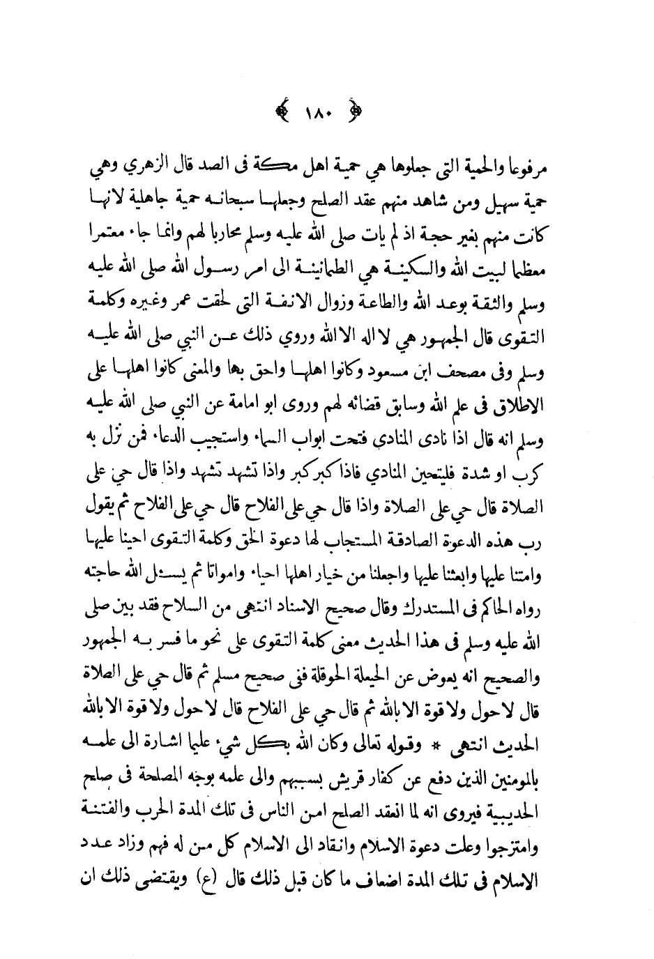 مرفوعا والحمية التي جعلوها هي حمية أهل مكة في الصد قال الزهري وهي حمية سهيل ومن شاهد منهم عقد الصلح وجعلها سبحانه حمية جاهلية لأنها كانت منهم بغير حجة إذ لم يأت ص - محاربا لهم وإنام جاء معتمرا معظما لبيت الله والسكينة هي الطمأنينة إلى أمر رسول الله ص - والثقة بوعد الله والطاعة وزوال الأنفة التي لحقت عمر وغيره وكلمة التقوى قال الجمهور هي لا إله إلا الله وروي ذلك عن النبي ص - وفي مصحف ابن مسعود وكانوا أهلها وأحق بها والمعنى كانوا أهلها على الإطلاق في علم الله وسابق قضائه لهم وروى أبو أمامة عن النبي ص - أنه قال إذا نادى المنادي فتحت أبواب السماء واستجيب الدعاء فمن نزل به كرب أو شدة فليتحين المنادي فإذا كبر كبر وإذا تشهد تشهد وإذا قال حي على الصلاة قال حي على الصلاة وإذا قال حي على الفلاح قال حي على الفلاح ثم يقول رب هذه الدعوة الصادقة المستجاب لها دعوة الحق وكلمة التقوى أحينا عليها وأمتنا عليها وابعثنا عليها واجعلنا من خيار أهلها أحياء وأمواتا ثم يسئل الله حاجته رواه الحاكم في المستدرك وقال صحيح الإسناد انتهى من السلاح فقد بين ص - في هذا الحديث معنى كلمة التقوى على نحو ما فسر به الجمهور والصحيح أنه يعوض عن الحيلة الحوقلة ففي صحيح مسلم ثم قال حي على الصلاة قال لا حول ولا قوة إلا بالله ثم قال حي على الفلاح قال لا حول ولا قوة إلا بالله الحديث انتهى