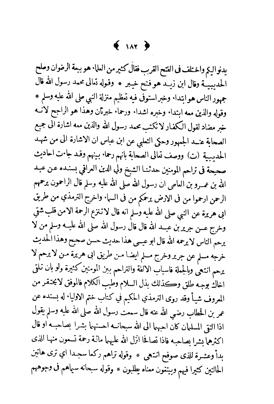 وقوله والذين معه ابتداء وخبره أشداء ورحماء خبر ثان وهذا هو الراجح لأنه خبر مضاد لقول الكفار لا تكتب محمد رسول الله والذين معه إشارة إلى جميع الصحابة عند الجمهور وحكى الثعلبي عن ابن عباس أن الإشارة إلى من شهد الحديبية ت ووصف تعالى الصحابة بأنهم رحماء بينهم وقد جاءت أحاديث صحيحة في تراحم المؤمنين حدثنا الشيخ ولي الدين العراقي بسنده عن عبدالله بن عمرو بن العاص أن رسول الله ص - قال الراحمون يرحمهم الرحمن ارحموا من في الأرض يرحمكم من في السماء وأخرج الترمذي من طريق أبي هريرة عن رسول الله ص - أنه قال لا تنزع الرحمة إلا من قلب شقي وخرج عن جرير بن عبدالله قال قال رسول الله ص - من لا يرحم الناس لا يC قال أبو عيسى هذا حديث حسن صحيح وهذا الحديث خرجه مسلم عن جرير وخرج مسلم أيضا من طريق أبي هريرة من لا يرحم لا يرحم انتهى وبالجملة فأسباب الألفة والتراحم بين المؤمنين كثيرة ولو بأن تلقى أخاك بوجه طلق وكذلك بذل السلام وطيب الكلام فالموفق لا يحتقر من المعروف شيأ وقد روى الترمذي الحكيم في كتاب ختم الأولياء له بسنده عن عمر بن الخطاب رضي الله عنه قال سمعت رسول الله ص - يقول إذا التقى المسلمان كان أحبهما إلى الله سبحانه أحسنهما بشرا بصاحبه أو قال أكثرهما بشرا بصاحبه فإذا تصافحا أنزل الله عليهما مائة رحمة تسعون منها للذي بدأ وعشرة للذي صوفح انتهى