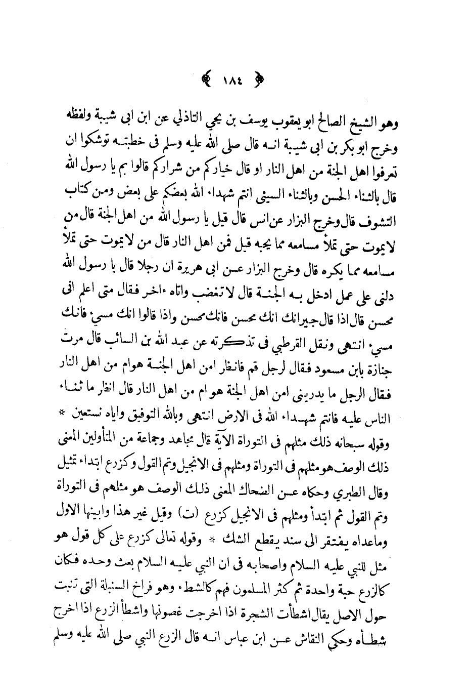 وهو الشيخ الصالح أبو يعقوب يوسف بن يحيى التاذلي عن ابن أبي شيبة ولفظه وخرج أبو بكر بن أبي شيبة أنه قال ص - في خطبته توشكوا أن تعرفوا أهل الجنة من أهل النار أو قال خياركم من شراركم قالوا بما يا رسول الله قال بالثناء الحسن وبالثناء السيئ أنتم شهداء الله بعضكم على بعض ومن كتاب التشوف قال وخرج البزار عن أنس قال قيل يا رسول الله من أهل الجنة قال من لا يموت حتى تملأ مسامعه مما يحبه قيل فمن أهل النار قال من لا يموت حتى تملأ مسامعه مما يكره قال وخرج البزار عن أبي هريرة أن رجلا قال يا رسول الله دلني على عمل أدخل به الجنة قال لا تغضب وأتاه آخر فقال متى أعلم أني محسن قال إذا قال جيرانك أنك محسن فإنك محسن وإذا قالوا أنك مسيء فإنك مسيء انتهى ونقل القرطبي في تذكرته عن عبدالله بن السائب قال مرت جنازة بابن مسعود فقال لرجل قم فانظر أمن أهل الجنة هو أم من أهل النار فقال الرجل ما يدريني أمن أهل الجنة هو أم من أهل النار قال انظر ما ثناء الناس عليه فأنتم شهداء الله في الأرض انتهى وبالله التوفيق وإياه نستعين