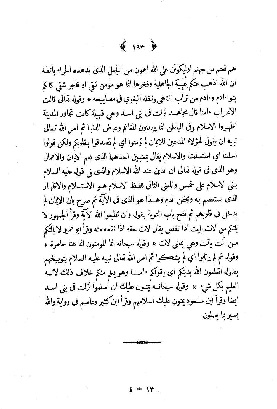 هم فحم من جهنم او ليكونن على الله اهون من الجعل الذي يدهده الخراء بانفه ان الله اذهب عنكم عبية الجاهلية وفخرها انما هو مؤمن تقي او فاجر شقي كلكم بنو آدم وآدم من تراب انتهى ونقله البغوي في مصابيحه وقوله تعالى قالت الأعراب آمنا قال مجاهد نزلت في بني اسد وهي قبيلة كانت تجاور المدينة اظهروا الاسلام وفي الباطن انما يريدون المغانم وعرض الدنيا ثم امر الله تعالى نبيه ان يقول لهؤلاء المدعين للايمان لم تؤمنوا أي لم تصدقوا بقلوبكم ولكن قولوا اسلمنا أي استسلمنا والاسلام يقال بمعنيين احدهما الذي يعم الايمان والاعمال وهو الذي في قوله تعالى ان الدين عند الله الاسلام والذي في قوله عليه السلام بني الاسلام على خمس والمعنى الثاني للفظ الاسلام هو الاستسلام والاظهار الذي يستعصم به ويحقن الدم وهذا هو الذي في الآية ثم صرح بان الايمان لم يدخل في قلوبهم ثم فتح باب التوبة بقوله وان تطيعوا الله الآية وقرأ الجمهور لا يلتكم من لات يليت اذا نقص يقال لات حقه اذا نقصه منه وقرأ ابو عمرو لا يالتكم من ألت يألت وهي بمعنى لات وقوله سبحانه انما المؤمنون انما هنا حاصرة وقوله ثم لم يرتابوا أي لم يشكوا ثم امر الله تعالى نبيه عليه السلام بتوبيخهم بقوله اتعلمون الله بدينكم أي بقولكم آمنا وهو يعلم منكم خلاف ذلك لأنه العليم بكل شيء وقوله سبحانه يمنون عليك ان اسلموا نزلت في بني اسد ايضا وقرأ ابن مسعود يمنون عليك اسلامهم وقرأ ابن كثير وعاصم في رواية والله بصير بما يعلمون