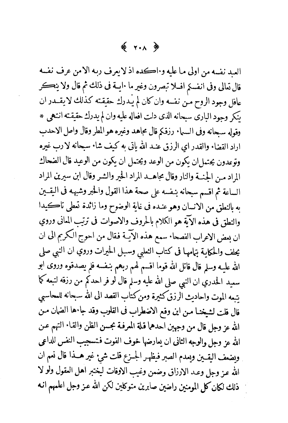العبد نفسه من اولى ما عليه وآكده اذا لا يعرف ربه الا من عرف نفسه قال تعالى وفي انفسكم افلا تبصرون وغير ما آية في ذلك ثم قال ولا ينكر عاقل وجود الروح من نفسه وان كان لم يدرك حقيقته كذلك لا يقدر ان ينكر وجود الباري سبحانه الذي دلت افعاله عليه وان لم يدرك حقيقته انتهى وقوله سبحانه وفي السماء رزقكم قال مجاهد وغيره هو المطر وقال واصل الاحدب اراد القضاء والقدر أي الرزق عند الله ياتي به كيف شاء سبحانه لا رب غيره وتوعدون يحتمل ان يكون من الوعد ويحتمل ان يكون من الوعيد قال الضحاك المراد من الجنة والنار وقال مجاهد المراد الخير والشر وقال ابن سيرين المراد الساعة ثم اقسم سبحانه بنفسه على صحة هذا القول والخبر وشبهه في اليقين به بالنطق من الانسان وهو عنده في غاية الوضوح وما زائدة تعطى تاكيدا والنطق في هذه الآية هو الكلام بالحروف والاصوات في ترتيب المعاني وروي ان بعض الاعراب الفصحاء سمع هذه الآية فقال من احوج الكريم الى ان يحلف والحكاية بتمامها في كتاب الثعلبي وسبل الخيرات وروي ان النبي ص - قال قاتل الله قوما اقسم لهم ربهم بنفسه فلم يصدقوه وروى ابو سعيد الخدري ان النبي ص - قال لو فر احدكم من رزقه لتبعه كما يتبعه الموت واحاديث الرزق كثيرة ومن كتاب القصد الى الله سبحانه للمحاسبي قال قلت لشيخنا من اين وقع الاضطراب في القلوب وقد جاءها الضمان من الله عز و جل قال من وجهين احدهما قلة المعرفة بحسن الظن والقاء التهم من الله عز و جل والوجه الثاني ان يعارضها خوف الفوت فتستجيب النفس للداعي ويضعف اليقين ويعد الصبر فيظهر الجزع قلت شيء غير هذا قال نعم ان الله عز و جل وعد الارزاق وضمن وغيب الاوقات ليختبر اهل العقول ولولا ذلك لكان كل المومنين راضين صابرين متوكلين لكن الله عز و جل اعلمهم انه