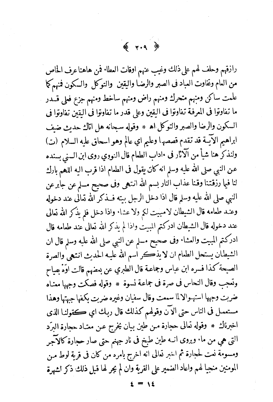 رازقهم وحلف لهم على ذلك وغيب عنهم اوقات العطاء فمن ها هنا عرف الخاص من العام وتفاوت العباد في الصبر والرضا واليقين والتوكل والسكون فمنهم كما علمت ساكن ومنهم متحرك ومنهم راض ومنهم ساخط ومنهم جزع فعلى قدر ما تفاوتوا في المعرفة تفاوتوا في اليقين وعلى قدر ما تفاوتوا في اليقين تفاوتوا في السكون والرضا والصبر والتوكل اه وقوله سبحانه هل اتاك حديث ضيف ابراهيم الآية قد تقدم قصصها وعليم أي عالم وهو اسحاق عليه السلام ت ولنذكر هنا شيئا في آداب الطعام قال النووي روى ابن السني بسنده عن النبي ص - انه كان يقول في الطعام اذا قرب اليه اللهم بارك لنا فيما رزقتنا وقنا عذاب النار بسم الله انتهى وفي صحيح مسلم عن جابر عن النبي ص - قال اذا دخل الرجل بيته فذكر الله تعالى عند دخوله وعند طعامه قال الشيطان لا مبيت لكم ولا عشاء واذا دخل فلم يذكر الله تعالى عند دخوله قال الشيطان ادركتم المبيت واذا لم يذكر الله تعالى عند طعامه قال ادركتم المبيت والعشاء وفي صحيح مسلم عن النبي ص - قال ان الشيطان يستحل الطعام ان لا يذكر اسم الله عليه الحديث انتهى والصرة الصيحة كذا فسره ابن عباس وجماعة قال الطبري عن بعضهم قالت اوه بصياح وتعجب وقال النحاس في صرة في جماعة نسوة وقوله فصكت وجهها معناه ضربت وجهها استهوالا لما سمعت وقال سفيان وغيره ضربت بكفها جبهتها وهذا مستعمل في الناس حتى الان وقولهم كذلك قال ربك أي كقولنا الذي اخبرناك وقوله تعالى حجارة من طين بيان يخرج عن معتاد حجارة البرد التي هي من ماء ويروى انه طين طبخ في نار جهنم حتى صار حجارة كالآجر ومسومة نعت لحجارة ثم اخبر تعالى انه اخرج بامره من كان في قرية لوط من المومنين منجيا لهم واعاد الضمير على القرية وان لم يجر لها قبل ذلك ذكر لشهرة