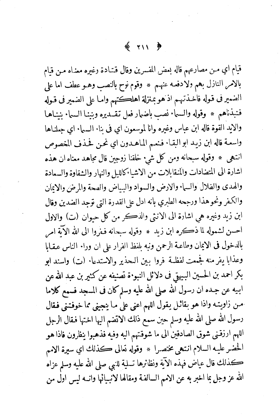 قيام أي من مصارعهم قاله بعض المفسرين وقال قتادة وغيره معناه من قيام بالامر النازل بهم ولا دفعه عنهم وقم نوح بالنصب وهو عطف اما على الضمير في قوله فاخذتهم اذ هو بمنزلة اهلكتهم واما على الضمير في قوله فنبذناهم وقوله والسماء نصب باضمار فعل تقديره وبنينا السماء بنيناها والايد القوة قاله ابن عباس وغيره وانا لموسعون أي في بناء السماء أي جعلناها واسعة قاله ابن زيد ابو البقاء فنعم الماهدون أي نحن فحذف المخصوص انتهى وقوله سبحانه ومن كل شيء خلقنا زوجين قال مجاهد معناه ان هذه اشارة الى المتضادات والمتقابلات من الاشياء كالليل والنهار والشقاوة والسعادة والهدى والضلال والسماء والارض والسواد والبياض والصحة والمرض والايمان والكفر ونحو هذا ورجحه الطبري بانه ادل على القدرة التي توجد الضدين وقال ابن زيد وغيره هي اشارة الى الانثى والذكر من كل حيوان ت والاول احسن لشموله لما ذكره ابن زيد وقوله سبحانه ففروا الى الله الآية امر بالدخول في الايمان وطاعة الرحمن ونبه بلفظ الفرار على ان وراء الناس عقابا وعذابا يفر منه فجمعت لفظه فروا بين التحذير والاستدعاء ت واسند ابو بكر احمد بن الحسين البيهقي في دلائل النبوءة تصنيفه عن كثير بن عبد الله عن ابيه عن جده ان رسول الله ص - كان في المسجد فسمع كلاما من زاويته واذا هو بقائل يقول اللهم اعني على ما ينجيني مما خوفتني فقال رسول الله ص - حين سمع ذلك الا تضم اليها اختها فقال الرجل اللهم ارزقني شوق الصادقين الى ما شوقتهم اليه وفيه فذهبوا ينظرون فاذا هو الخضر عليه السلام انتهى مختصرا وقوله تعالى كذلك أي سيرة الامم كذلك قال عياض فهذه الآية ونظائرها تسلية للنبي ص - عزاه الله عز و جل بما اخبر به عن الامم السالفة ومقالها لانبيائها وانه ليس اول من