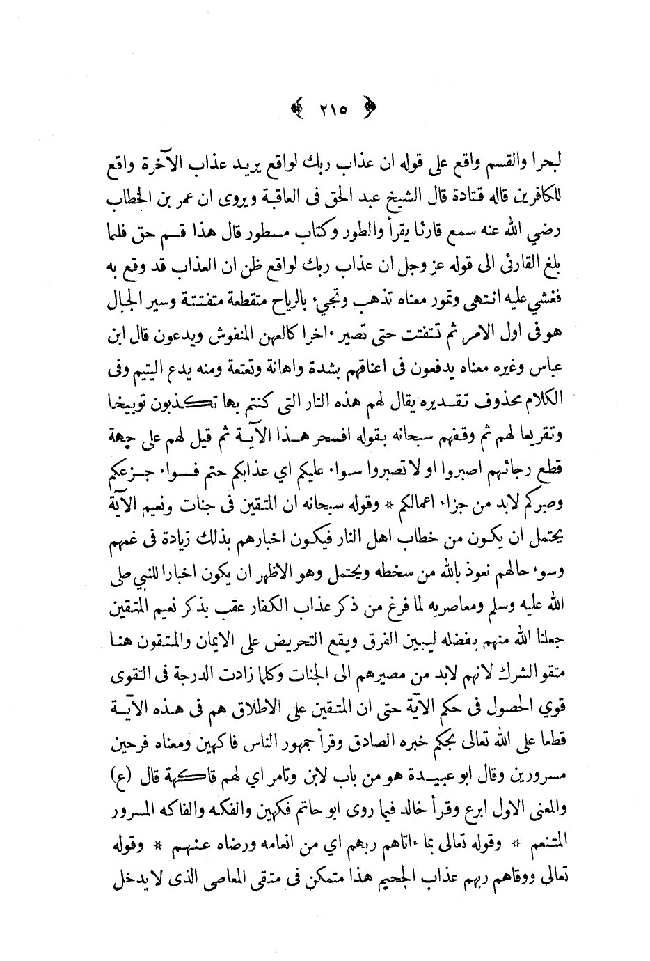 لبحرا والقسم واقع على قوله ان عذاب ربك لواقع يريد عذاب الآخرة واقع للكافرين قاله قتادة قال الشيخ عبد الحق في العاقبة ويروى ان عمر بن الخطاب رضي الله عنه سمع قارئا يقرأ والطور وكتاب مسطور قال هذا قسم حق فلما بلغ القارىء الى قوله عز و جل ان عذاب ربك لواقع ظن ان العذاب قد وقع به فغشي عليه انتهى وتمور معناه تذهب وتجيء بالرياح متقطعة متفتتة وسير الجبال هو في اول الامر ثم تتفتت حتى تصير آخرا كالعهن المنفوش ويدعون قال ابن عباس وغيره معناه يدفعون في اعناقهم بشدة واهانة وتعتمة ومنه يدع اليتيم وفي الكلام محذوف تقديره يقال لهم هذه النار التي كنتم بها تكذبون توبيخا وتقريعا لهم ثم وقفهم سبحانه بقول افسحر هذة الآية ثم قيل لهم على جهة قطع رجائهم اصبروا او لا تصبروا سواء عليكم أي عذابكم حتم فسواء جزعكم وصبركم لا بد من جزاء اعمالكم وقوله سبحانه ان المتقين في جنات ونعيم الآية يحتمل ان يكون من خطاب اهل النار فيكون اخبارهم بذلك زيادة في غمهم وسوء حالهم نعوذ بالله من سخطه ويحتمل وهو الاظهر ان يكون اخبارا للنبي ص - ومعاصريه لما فرغ من ذكر عذاب الكفار عقب بذكر نعيم المتقين جعلنا الله منهم بفضله ليبين الفرق ويقع التحريض على الايمان والمتقون هنا متقوا الشرك لأنهم لا بد من مصيرهم الى الجنات وكلما زادت الدرجة في التقوى قوي الحصول في حكم الآية حتى ان المتقين على الإطلاق هم في هذه الآية قطعا على الله تعالى بحكم خبره الصادق وقرأ جمهور الناس فاكهين ومعناه فرحين مسرورين وقال ابو عبيدة هو من باب لابن وتامر أي لهم فاكهة قال ع والمعنى الاول ابرع وقرأ خالد فيما روى ابو حاتم فكهين والفكه والفاكه المسرور المتنعم وقوله تعالى بما أتاهم ربهم أي من انعامه ورضاه عنهم وقوله تعالى ووقاهم ربهم عذاب الجحيم هذا متمكن في متقى المعاصي الذي لا يدخل
