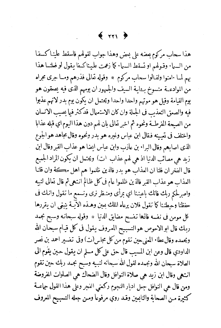 هذا سحاب مركوم بعضه على بعض وهذا جواب لقولهم فاسقط علينا كسفا من السماء وقولهم او تسقط السماء كما زعمت علينا كسفا يقول لو فعلنا هذا بهم لما آمنوا ولقالوا سحاب مركوم وقوله تعالى فذرهم وما جرى مجراه من الموادعة منسوخ بآية السيف والجمهور ان يومهم الذي فيه يصعقون هو يوم القيامة وقيل هو موتهم واحدا واحدا ويحتمل ان يكون يوم بدر لانهم عذبوا فيه والصعق التعذيب في الجملة وان كان الاستعمال قد كثر فيما يصيب الانسان من الصيحة المفرطة ونحوه ثم اخبر تعالى بان لهم دون هذا اليوم أي قبله عذابا واختلف في تعيينه فقال ابن عباس وغيره هو بدر ونحوه وقال مجاهد هو الجوع الذي اصابهم وقال البراء بن عازب وابن عباس ايضا هو عذاب القبر وقال ابن زيد هي مصائب الدنيا اذ هي لهم عذاب ت ويحتمل ان يكون المراد الجميع قال الفخر ان قلنا ان العذاب هو بدر فالدين ظلموا هم اهل مكة وان قلنا العذاب هو عذاب القبر فالذين ظلموا عام في كل ظالم انتهى ثم قال تعالى لنبيه واصبر لحكم ربك فانك باعيننا أي بمرأي ومنظر نرى ونسمع ما تقول وانك في حفظنا وحيطتنا كما تقول فلان يرعاه الملك بعين وهذه الآية ينبغي ان يقررها كل مومن في نفسة فانها تفسح مضايق الدنيا وقوله سبحانه وسبح بحمد ربك قال ابو الاحوص هو التسبيح المعروف يقول في كل قيام سبحان الله وبحمده وقال عطاء المعنى حين تقوم من كل مجلس ت وفي تفسير احمد بن نصر الداودي قال وعن ابن المسيب قال حق على كل مسلم ان يقول حين يقوم الى الصلاة سبحان الله وبحمده لقول الله سبحانه لنبيه وسبح بحمد ربك حين تقوم انتهى وقال ابن زيد هي صلاة النوافل وقال الضحاك هي الصلوات المفروضة ومن قال هي النوافل جعل ادبار النجوم ركعتي الفجر وعلى هذا القول جماعة كثيرة من الصحابة والتابعين وقد روي مرفوعا ومن جعله التسبيح المعروف