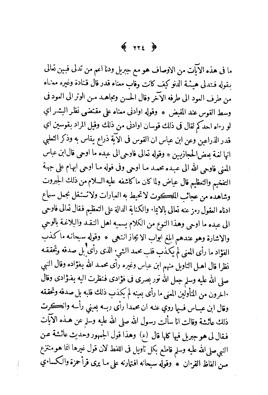 ما في هذه الآيات من الأوصاف هو مع جبريل ودنا اعم من تدلى فبين تعالى بقوله فتدلى هيئة الدنو كيف كانت وقاب معناه قدر قال قتادة وغيره معناه من طرف العود الى طرفه الآخر وقال الحسن ومجاهد من الوتر الى العود في وسط القوس عند المقبض وقوله او ادنى معناه على مقتضى نظر البشر أي لو رآه احدكم لقال في ذلك قوسان او ادنى من ذلك وقيل المراد بقوسين أي قدر الذراعين وعن ابن عباس ان القوس في الآية ذراع يقاس به وذكر الثعلبي انها لغة بعض الحجازيين وقوله تعالى فاوحى الى عبده ما اوحى قال ابن عباس المعنى فاوحى الله الى عبده محمد ما اوحى وفي قوله ما اوحى ابهام على جهة التفخيم والتعظيم قال عياض ولما كان ما كاشفه عليه السلام من ذلك الجبروت وشاهده من عجائب الملكوت لا تحيط به العبارات ولا تستقل بحمل سماع ادناه العقول رمز عنه تعالى بالايماء والكناية الدالة على التعظيم فقال تعالى فاوحى الى عبده ما اوحى وهذا النوع من الكلام يسميه اهل النقد والبلاغة بالوحي والاشارة وهو عندهم ابلغ ابواب الايجاز انتهى وقوله سبحانه ما كذب الفؤاد ما رأى المعنى لم يكذب قلب محمد الشيء الذي رأى بل صدقه وتحققه نظرا قال اهل التأويل منهم ابن عباس وغيره رأى محمد الله بفؤاده وقال النبي ص - جعل الله نور بصري في فؤادي فنظرت اليه بفؤادي وقال آخرون من المتأولين المعنى ما راى بعينه لم يكذب ذلك قلبه بل صدقه وتحققه وقال ابن عباس فيما روي عنه ان محمدا رأى ربه بعيني راسه وانكرت ذلك عائشة وقالت انا سألت رسول الله ص - عن هذه الآيات فقال لي هو جبريل فيها كلها قال ع وهذا قول الجمهور وحديث عائشة عن النبي ص - قاطع بكل تاويل في اللفظ لان قول غيرها انما هو منتزع من الفاظ القرآن وقوله سبحانه افتمارنه على ما يرى قرأ حمزة والكساءي