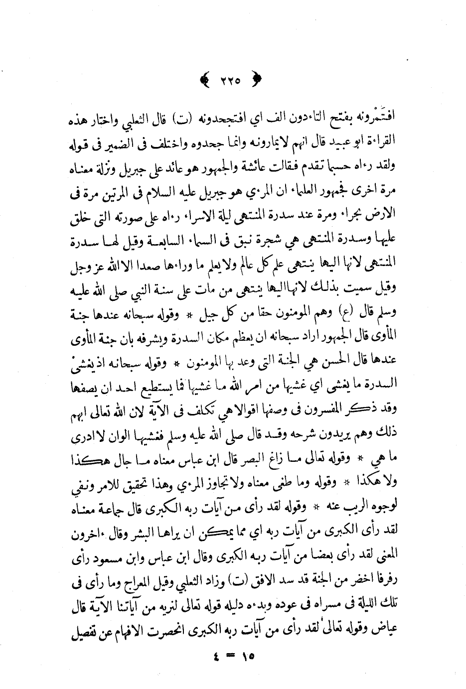 افتمرونه بفتح التاء دون الف أي افتجحدونه ت قال الثعلبي واختار هذه القراءة ابو عبيد قال انهم لا يمارونه وانما جحدوه واختلف في الضمير في قوله ولقد رآه حسبما تقدم فقالت عائشة والجمهور هو عائد على جبريل ونزله معناه مرة اخرى فجمهور العلماء ان المرءي هو جبريل عليه السلام في المرتين مرة في الارض بحراء ومرة عند سدرة المنتهى ليلة الاسراء رآه على صورته التي خلق عليها وسدرة المنتهى هي شجرة نيق في السماء السابعة وقيل لها سدرة المنتهى لأنها اليها ينتهي علم كل عالم ولا يعلم ما وراءها صعدا الا الله عز و جل وقيل سميت بذلك لأنها اليها ينتهي من مات على سنة النبي ص - قال ع وهم المومنون حقا من كل جيل وقوله سبحانه عندها جنة المأوى قال الجمهور اراد سبحانه ان يعظم مكان السدرة ويشرفه بان جنة المأوى عندها قال الحسن هي الجنة التي وعد بها المومنون وقوله سبحانه اذ يغشى السدرة ما يغشى أي غشيها من امر الله ما غشيها فما يستطيع احد ان يصفها وقد ذكر المفسرون في وصفها اقوالا هي تكلف في الآية لأن الله تعالى ابهم ذلك وهم يريدون شرحه وقد قال ص - فغشيها الوان لا ادرى ما هي وقوله تعالى ما زاغ البصر قال ابن عباس معناه ما جال هكذا ولا هكذا وقوله وما طغى معناه ولا تجاوز المرءي وهذا تحقيق للامر ونفي لوجوه الريب عنه وقوله لقد رأى من آيات ربه الكبرى قال جماعة معناه لقد رأى الكبرى من آيات ربه أي مما يمكن ان يراها البشر وقال آخرون المضى لقد رأى بعضا من آيات ربه الكبرى وقال ابن عباس وابن مسعود رأى رفرفا أخضر من الجنة قد سد الافق ت وزاد الثعلبي وقيل المعراج وما رأى في تلك الليلة في مسراه في عوده وبدءه دليله قوله تعالى لنريه من آياتنا الآية قال عياض وقوله تعالى لقد رأى من آيات ربه الكبرى انحصرت الافهام عن تفصيل