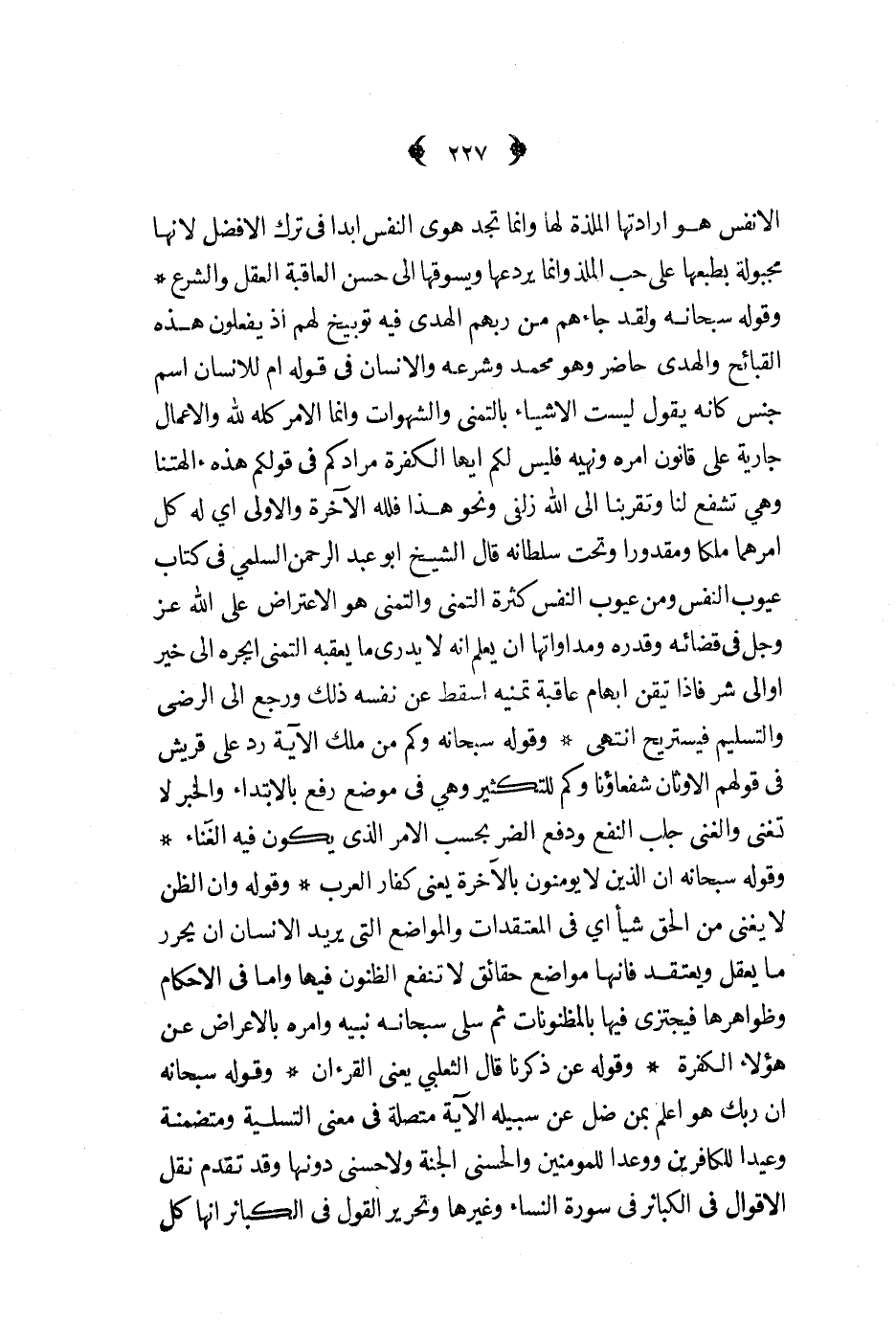 الانفس هو ارادتها الملذة لها وانما تجد هوى النفس ابدا في ترك الأفضل لآنها مجبولة بطبعها على حب الملذ وانما يردعها ويسوقها الى حسن العاقبة العقل والشرع وقوله سبحانه ولقد جاءهم من ربهم الهدى فيه توبيخ لهم اذ يفعلون هذه القبائح والهدى حاضر وهو محمد وشرعه والانسان في قوله ام للانسان اسم جنس كانه يقول ليست الاشياء بالتمنى والشهوات وانما الامر كله لله والاعمال جارية على قانون امره ونهيه فليس لكم ايها الكفرة مرادكم في قولكم هذه آلهتنا وهي تشفع لنا وتقربنا الى الله زلفى ونحو هذا فلله الآخرة والاولى أي له كل امرهما ملكا ومقدورا وتحت سلطانه قال الشيخ ابو عبد الرحمن السلمي في كتاب عيوب النفس ومن عيوب النفس كثرة التمني والتمنى هو الاعتراض على الله عز و جل في قضائه وقدره ومداواتها ان يعلم انه لا يدري ما يعقبه التمني ايجره الى خير او الى شر فاذا تيقن ابهام عاقبة تمنيه اسقط عن نفسه ذلك ورجع الى الرضى والتسليم فيستريح انتهى وقوله سبحانه وكم من ملك الآية رد على قريش في قولهم الأوثان شفعاؤنا وكم للتكثير وهي في موضع رفع بالابتداء والخبر لا تغنى والغنى جلب النفع ودفع الضر بحسب الأمر الذي يكون فيه الغناء وقوله سبحانه ان الذين لا يؤمنون بالاخرة يعني كفار العرب وقوله وان الظن لا يغني من الحق شيئا أي في المعتقدات والمواضع التي يريد الانسان ان يحرر ما يعقل ويعتقد فانها مواضع حقائق لا تنفع الظنون فيها واما في الاحكام وظواهرها فيجتزى فيها بالمظنونات ثم سلى سبحانه نبيه وامره بالاعراض عن هؤلاء الكفرة وقوله عن ذكرنا قال الثعلبي يعني القرآن وقوله سبحانه ان ربك هو اعلم بمن ضل عن سبيله الآية متصلة في معنى التسلية ومتضمنة وعيدا للكافرين ووعدا للمؤمنين والحسنى الجنة ولا حسنى دونها وقد تقدم نقل الأقوال في الكبائر في سورة النساء وغيرها وتحرير القول في الكبائر انها كل