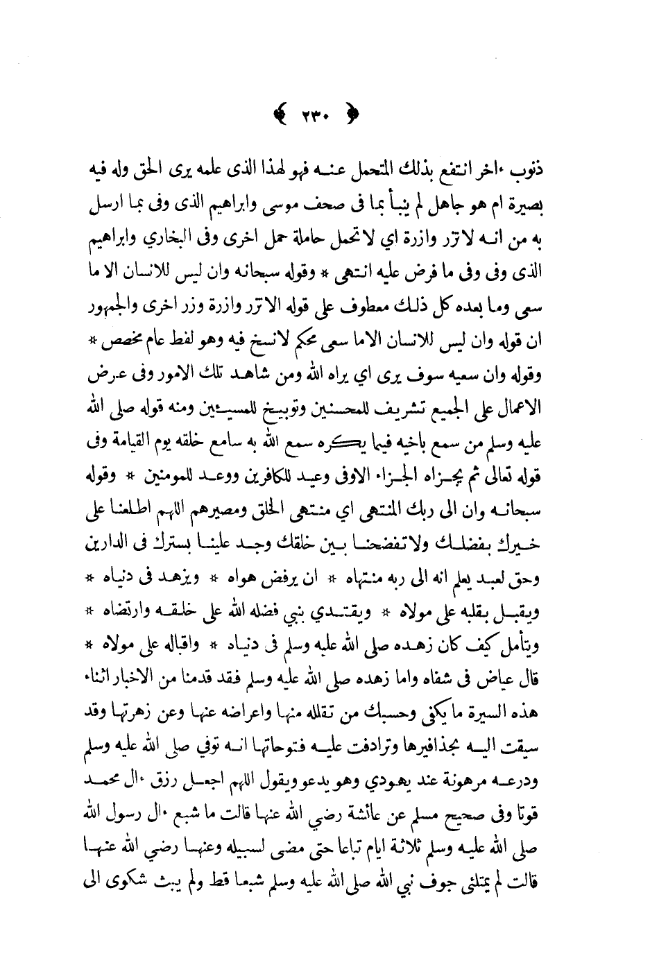 ذنوب آخر انتفع بذلك المتحمل عنه فهو لهذا الذي علمه يرى الحق وله فيه بصيرة ام هو جاهل لم ينبأ بما في صحف موسى وابراهيم الذي وفى بما ارسل به من انه لا تزر وازرة أي لا تحمل حاملة حمل اخرى وفي البخاري وابراهيم الذي وفى وفى ما فرض عليه انتهى وقوله سبحانه وان ليس للانسان الا ما سعى وما بعده كل ذلك معطوف على قوله الا تزر وازرة وزر اخرى والجمهور ان قوله وان ليس للانسان الا ما سعى محكم لا نسخ فيه وهو لفظ عام مخصص وقوله وان سعيه سوف يرى أي يراه الله ومن شاهد تلك الامور وفي عرض الاعمال على الجميع تشريف للمحسنين وتوبيخ للمسيئين ومنه قوله ص - من سمع باخيه فيما يكره سمع الله به سامع خلقه يوم القيامة وفي قوله تعالى ثم يجزاه الجزاء الاوفى وعيد للكافرين ووعد للمومنين وقوله سبحانه وان الى ربك المنتهى أي منتهى الخلق ومصيرهم اللهم اطلعنا على خيرك بفضلك ولا تفضحنا بين خلقك وجد علينا بسترك في الدارين وحق لعبد يعلم انه الى ربه منتهاه ان يرفض هواه ويزهد في دنياه ويقبل بقلبه على مولاه ويقتدي بنبي فضله الله على خلقه وارتضاه ويتأمل كيف كان زهده ص - في دنياه واقباله على مولاه قال عياض في شفاه واما زهده ص - فقد قدمنا من الاخبار اثناء هذه السيرة ما يكفي وحسبك من تقلله منها واعراضه عنها وعن زهرتها وقد سيقت اليه بحذافيرها وترادفت عليه فتوحاتها انه توفي ص - ودرعة مرهونة عند يهودي وهو يدعو ويقول اللهم اجعل رزق آل محمد قوتا وفي صحيح مسلم عن عائشة رضي الله عنها قالت ما شبع آل رسول الله ص - ثلاثة أيام تباعا حتى مضى لسبيله وعنها رضي الله عنها قالت لم يمتلئى جوف نبي الله ص - شبعا قط ولم يبث شكوى الى