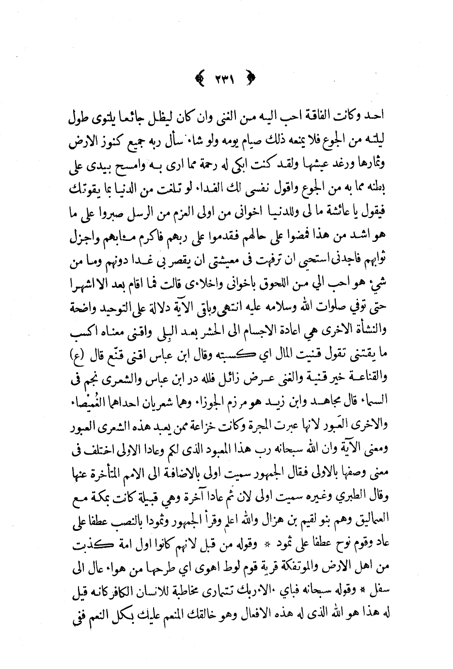 احد وكانت الفاقة احب اليه من الغنى وان كان ليظل جائعا يلتوى طول ليلته من الجوع فلا يمنعه ذلك صيام يومه ولو شاء سأل ربه جميع كنوز الأرض وثمارها ورغد عيشها ولقد كنت ابكي له رحمة مما ارى به وامسح بيدي على بطنه مما به من الجوع واقول نفسي لك الفداء لو تلغت من الدنيا بما يقوتك فيقول يا عائشة ما لي وللدنيا اخواني من اولى العزم من الرسل صبروا على ما هو اشد من هذا فمضوا على حالهم فقدموا على ربهم فاكرم مئابهم واجزل ثوابهم فاجدني استحيي ان ترفهت في معيشتي ان يقصر بي غدا دونهم وما من شيء هو احب الي من اللحوق باخواني واخلاءي قالت فما اقام بعد الا اشهرا حتى توفي صلوات الله وسلامه عليه انتهى وباقي الآية دلالة على التوحيد واضحة والنشأة الأخرى هي اعادة الاجسام الى الحشر بعد البلى واقنى معناه اكسب ما يقتنى تقول قنيت المال أي كسبته وقال ابن عباس اقنى قنع قال ع والقناعة خير قنية والغنى عرض زائل فلله در ابن عباس والشعري نجم في السماء قال مجاهد وابن زيد هو مرزم الجوزاء وهما شعريان احداهما الفميصاء والاخرى العبور لانها عبرت المجرة وكانت خزاعة ممن يعبد هذه الشعرى العبور ومعنى الآية وان الله سبحانه رب هذا المعبود الذي لكم وعادا الاولى اختلف في معنى وصفها بالاولى فقال الجمهور سميت اولى بالاضافة الى الامم المتأخرة عنها وقال الطبري وغيره سميت اولى لان ثم عادا آخرة وهي قبيلة كانت بمكة مع العماليق وهم بنو لقيم بن هزال والله اعلم وقرأ الجمهور وثموادا بالنصب عطفا على عاد وقوم نوح عطفا على ثمود وقوله من قبل لانهم كانوا اول امة كذبت من اهل الأرض والموتفكة قرية قوم لوط اهوى أي طرحها من هواء عال الى سفل وقوله سبحانه فبأي آلاء ربك تتمارى مخاطبة للانسان الكافر كانه قيل له هذا هو الله الذي له هذه الأفعال وهو خالقك المنعم عليك بكل النعم ففي