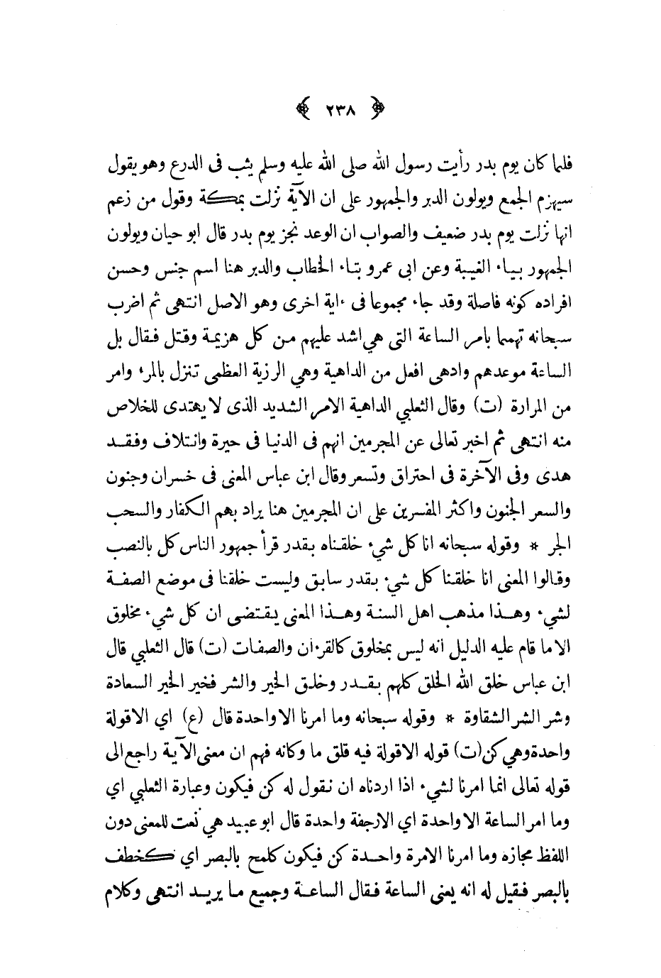 وقوله سبحانه إنا كل شيء خلقناه بقدر قرأ جمهور الناس كل بالنصب وقالوا المعنى إنا خلقنا كل شيء بقدر سابق وليست خلقنا في موضع الصفة لشيء وهذا مذهب أهل السنة وهذا المعنى يقتضي أن كل شيء مخلوق إلا ما قام عليه الدليل أنه ليس بمخلوق كالقرآن والصفات ت قال الثعالبي قال ابن عباس خلق الله الخلق كلهم بقدر وخلق الخير والشر فخير الخير السعادة وشر الشر الشقاوة