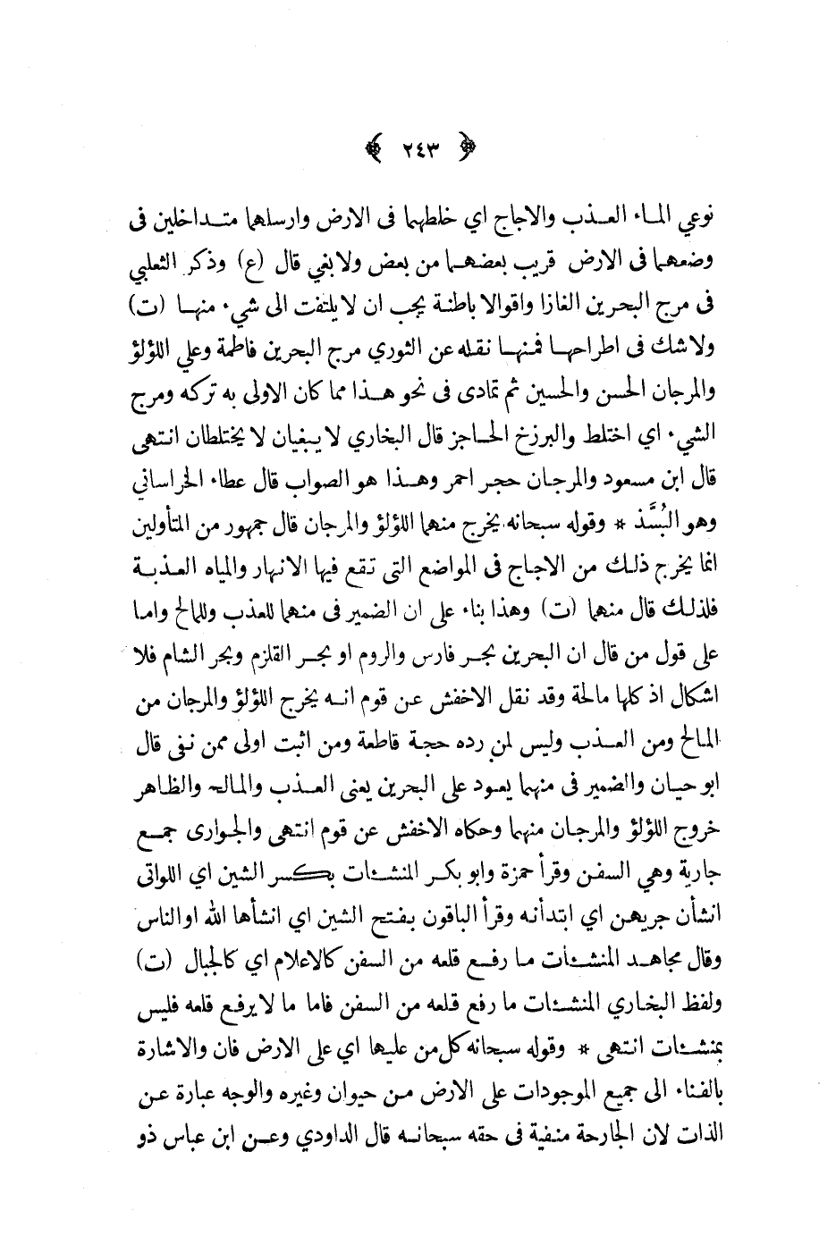نوعي الماء العذب والأجاج أي خلطهما في الأرض وأرسلهما متداخلين في وضعهما في الأرض قريب بعضهما من بعض ولا بغي قال ع وذكر الثعالبي في مرج البحرين ألغازا وأقوالا باطنة يجب أن لا يلتفت إلى شيء منها ت ولا شك في اطراحها فمنها نقله عن الثوري مرج البحرين فاطمة وعلي اللؤلؤ والمرجان الحسن والحسين ثم تمادى في نحو هذا مما كان الأولى به تركه ومرج الشيء أي اختلط والبرزخ الحاجز قال البخاري لا يبغيان لا يختلطان انتهى قال ابن مسعود والمرجان حجر أحمر وهذا هو الصواب قال عطاء الخراساني وهو البسذ