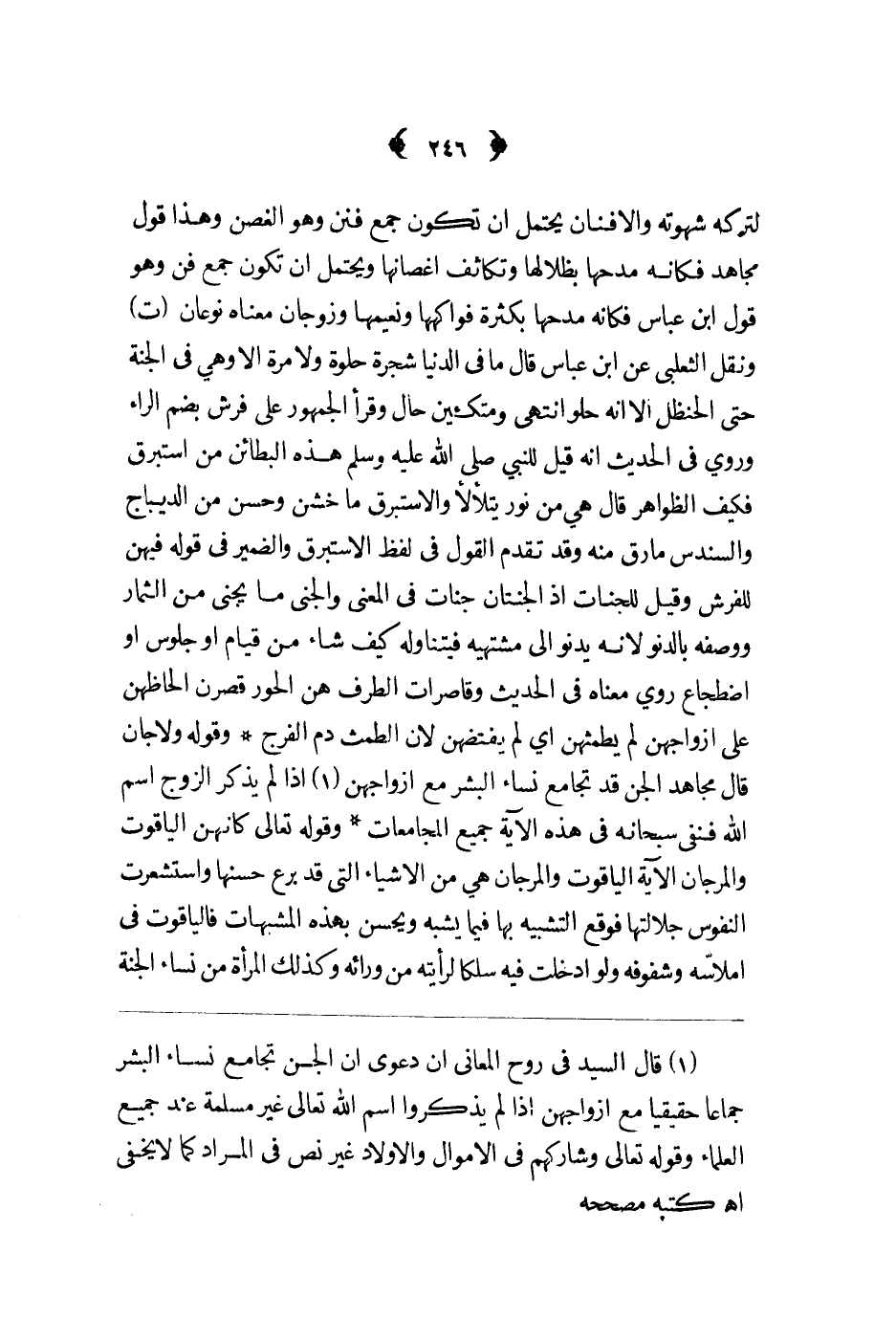 لتركه شهوته والأفنان يحتمل أن تكون جمع فنن وهو الغصن وهذا قول مجاهد فكأنه مدحها بظلالها وتكاثف أغصانها ويحتمل أن تكون جمع فن وهو قول ابن عباس فكأنه مدحها بكثرة فواكهها ونعيمها وزوجان معناه نوعات ت ونقل الثعلبي عن ابن عباس قال ما في الدنيا شجرة حلوة ولا مرة إلا وهي في الجنة حتى الحنظل إلا أنه حلو انتهى ومتكئين حال وقرأ الجمهور على فرش بضم الراء وروي في الحديث أنه قيل للنبي ص - هذه البطائن من استبرق فكيف الظواهر قال هي من نور يتلألأ والاستبرق ما خشن وحسن من الديباج والسندس ما رق منه وقد تقدم القول في لفظ الاستبرق والضمير في قوله فيهن للفرش وقيل للجنات إذ الجنتان جنات في المعنى والجنى ما يجني من الثمار ووصفه بالدنو لأنه يدنو إلى مشتهيه فيتناوله كيف شاء من قيام أو جلوس أو اضطجاع روي معناه في الحديث وقاصرات الطرف هن الحور قصرن الحاظهن على أزواجهن لم يطمثهن أي لم يفتضهن لأن الطمث دم الفرج