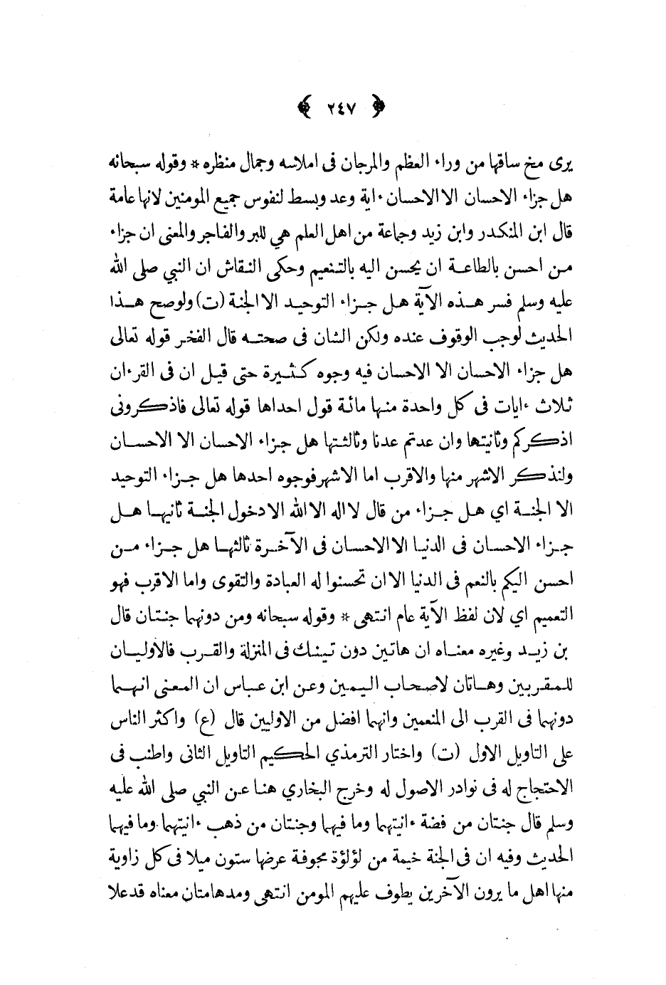 وقوله سبحانه هل جزاء الإحسان إلا الإحسان آية وعد وبسط لنفوس جميع المؤمنين لأنها عامة قال ابن المنكدر وابن زيد وجماعة من أهل العلم هي للبر والفاجر والمعنى أن جزاء من أحسن بالطاعة أن يحسن إليه بالتنعيم وحكى النقاش أن النبي ص - فسر هذه الآية هل جزاء التوجيد إلا الجنة ت ولو صح هذا الحديث لوجب الوقوف عنده ولكن الشان في صحته قال الفخر قوله تعالى هل جزاء الاحسان إلا الاحسان فيه وجوه كثيرة حتى قيل أن في القرآن ثلاث آيات في كل واحدة منها مائة قول إحداها قوله تعالى فاذكروني اذكركم وثانيتها وإن عدتم عدنا وثالثتها هل جزاء الاحسان إلا الاحسان ولنذكر الأشهر منها والأقرب أما الأشهر فوجوه أحدها هل جزاء التوحيد إلا الجنة أي هل جزاء من قال لا إله إلا الله إلا دخول الجنة ثانيها هل جزاء الاحسان في الدنيا إلا الاحسان في الآخرة ثالثها هل جزاء من أحسن اليكم بالنعم في الدنيا إلا أن تحسنوا له العبادة والتقوى وأما الأقرب فهو التعميم أي لأن لفظ الآية عام انتهى