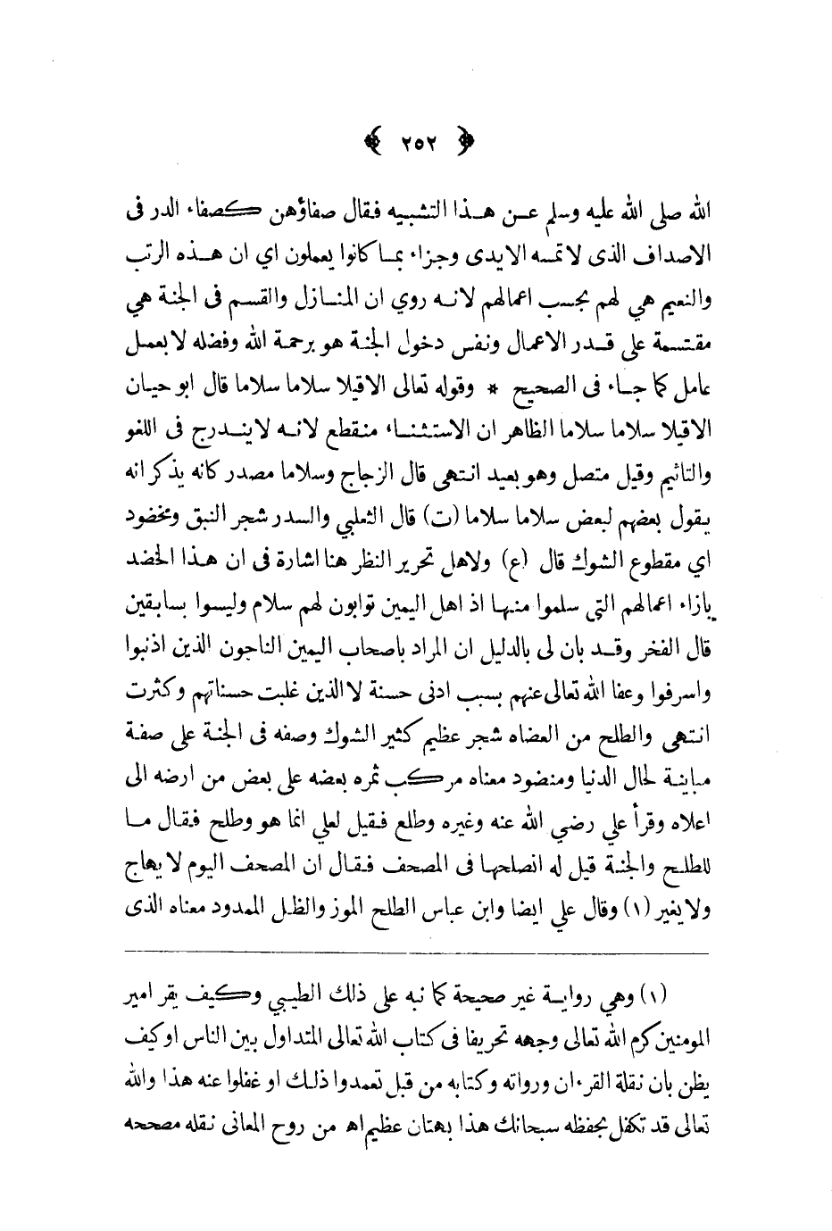 وقوله تعالى إلا قيلا سلاما سلاما قال أبو حيان إلا قيلا سلاما سلاما الظاهر أن الاستثناء منقطع لأنه لا يندرج في اللغو والتأثيم وقيل متصل وهو بعيد انتهى قال الزجاج وسلاما مصدر كأنه يذكر انه يقول بعضهم لبعض سلاما سلاما ت قال الثعلبي والسدر شجر النبق ومخضود أي مقطوع الشوك قال ع ولأهل تحرير النظر هنا إشارة في أن هذا الخذد بإزاء أعمالهم التي سلموا منها إذ أهل اليمين توابون لهم سلام وليسوا بسابقين قال الفخر وقد بان لي بالدليل أن المراد بأصحاب اليمين الناجون الذين أذنبوا وأسرفوا وعفا الله تعالى عنهم بسبب أدنى حسنة لا الذين غلبت حسناتهم وكثرت انتهى والطلح من العضاة شجر عظيم كثير الشوك وصفه في الجنة على صفة مباينة لحال الدنيا ومنضود معناه مركب ثمره بعضه على بعض من أرضه إلى أعلاه وقرأ علي رضي الله عنه وغيره وطلع فقيل لعلي إنما هو وطلح فقال ما للطلح والجنة قيل له أنصلحها في المصحف فقال أن المصحف اليوم لا يهاج ولا يغير وقال علي أيضا وابن عباس الطلح الموز والظل الممدود معناه الذي