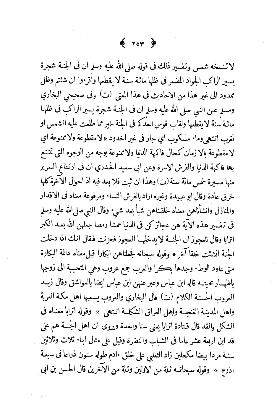تنسخه شمس وتفسير ذلك في قوله ص - أن في الجنة شجرة يسير الراكب الجواد المضمر في ظلها مائة سنة لا يقطعها واقرءوا إن شئتم وظل ممدود إلى غير هذا من الأحاديث في هذا المعنى ت وفي صحيحي البخاري ومسلم عن النبي ص - أن في الجنة شجرة يسير الراكب في ظلها مائة سنة لا يقطعها ولقاب قوس أحدكم في الجنة خير مما طلعت عليه الشمس أو تغرب انتهى وماء مسكوب أي جار في غير أخدود لا مقطوعة ولا ممنوعة أي لا مقطوعة بالأزمان كحال فاكهة الدنيا ولا ممنوعة بوجه من الوجوه التي تمتنع بها فاكهة الدنيا والفرش الأسرة وعن أبي سعيد الخدري أن في ارتفاع السرير منها مسيرة خمس مائة سنة ت وهذا إن ثبت فلا بعد فيه إذ أحوال الآخرة كلها خرق وعادة وقال أبو عبيدة وغيره أراد بالفرش النساء ومرفوعة معناه في الأقدار والمنازل وأنشأناهن معناه خلقناهن شيئا بعد شيئ وقال النبي ص - في تفسير هذه الآية هن عجائزكن في الدنيا عمشا رمصا جعلهن الله بعد الكبر أترابا وقال للعجوز أن الجنة لا يدخلها العجوز فحزنت فقال إنك إذا دخلت الجنة أنشئت خلقا آخر