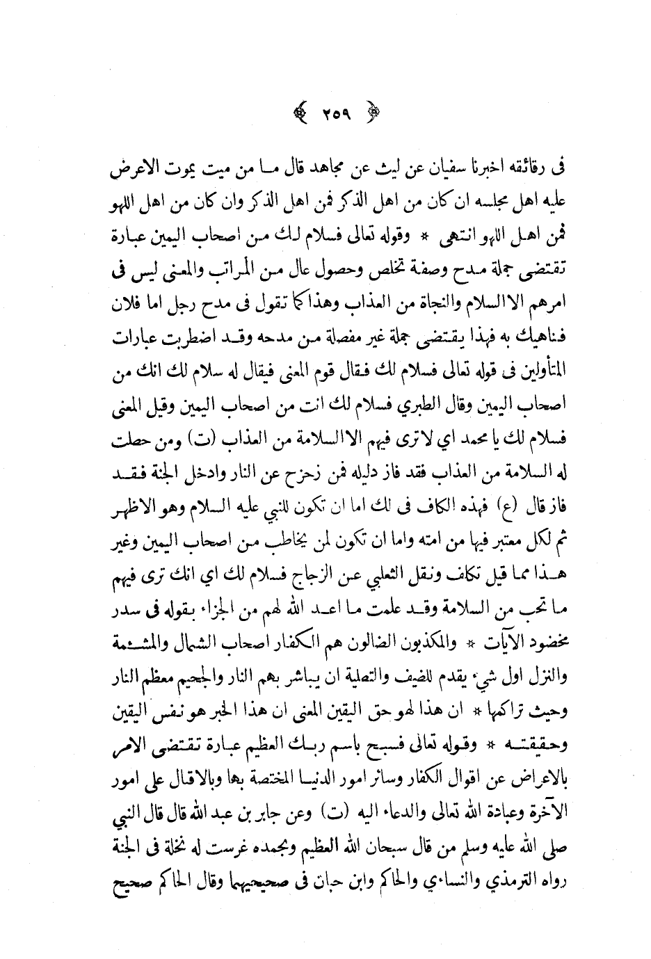 وقوله تعالى فسبح باسم ربك العظيم عبارة تقتضي الأمر بالأعراض عن أقوال الكفار وسائر أمور الدنيا المختصة بها وبالإقبال على أمور الآخرة وعبادة الله تعالى والدعاء إليه ت وعن جابر بن عبد الله قال قال النبي ص - من قال سبحان الله العظيم وبحمده غرست له نخلة في الجنة رواه الترمذي والنساءي والحاكم وابن حبان في صحيحيهما وقال الحاكم صحيح