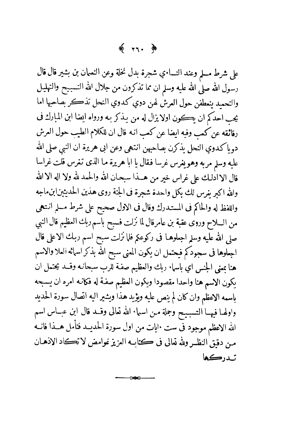 على شرط مسلم وعند النساءي شجرة بدل نخلة وعن النعمان بن بشير قال قال رسول الله ص - أن مما تذكرون من جلال الله التسبيح والتهليل والتحميد ينعطفن حول العرش لهن دوي كدوي النحل تذكر بصاحبها أما يحب أحدكم أن يكون ألا يزال له من يذكر به ورواه أيضا ابن المبارك في رقائقه عن كعب وفيه ايضا عن كعب أنه قال أن للكلام الطيب حول العرش دويا كدوي النحل يذكرن بصاحبهن انتهى وعن أبي هريرة أن النبي ص - مر به وهو يغرس غرسا فقال يا أبا هريرة ما الذي تغرس قلت غراسا قال ألا أدلك على غراس خير من هذا سبحان الله والحمد لله ولا إله إلا الله والله أكبر يغرس لك بكل واحدة شجرة في الجنة روى هذين الحديثين ابن ماجه واللفظ له والحاكم في المستدرك وقال في الأول صحيح على شرط مسلم انتهى من السلاح وروى عقبة بن عامر قال لما نزلت فسبح باسم ربك العظيم قال النبي ص - اجعلوها في ركوعكم فلما نزلت سبح اسم ربك الأعلى قال اجعلوها في سجودكم فيحتمل أن يكو المعنى سبح الله بذكر أسمائه العلا والاسم هنا بمعنى الجنس أي بأسماء ربك والعظيم صفة للرب سبحانه وقد يحتمل أن يكون الاسم هنا واحدا مقصودا ويكون العظيم صفة له فكأنه أمره أن يسبحه باسمه الأعظم وإن كان لم ينص عليه ويؤيد هذا ويشير إليه اتصال سورة الحديد وأولها فيها التسبيح وجملة من أسماء الله تعالى وقد قال ابن عباس اسم الله الأعظم موجود في ست آيات من أول سورة الحديد فتأمل هذا فإنه من دقيق النظر ولله تعالى في كتابه العزيز غوامض لا تكاد الأذهان تدركها