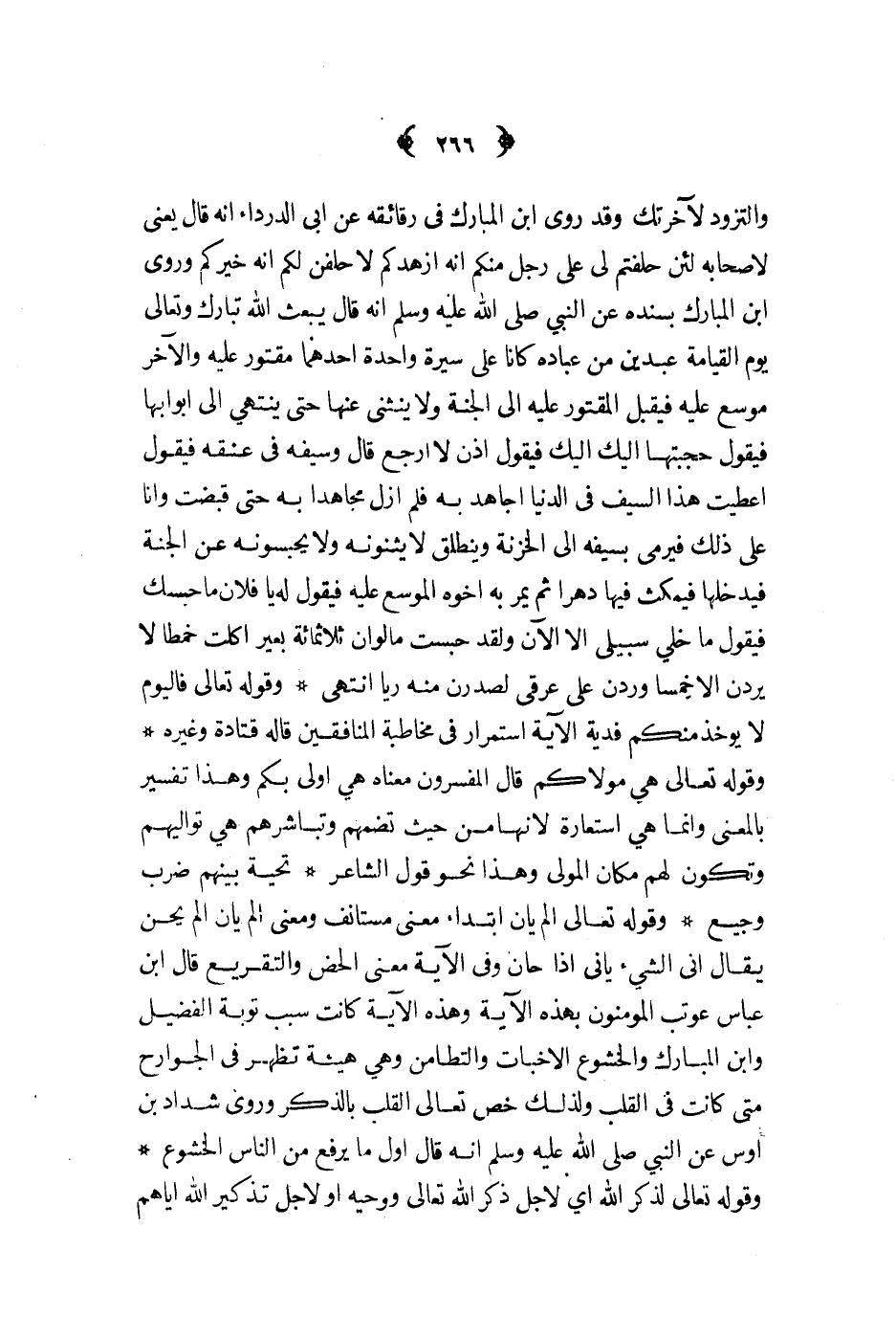 والتزود لآخرتك وقد روى ابن المبارك في رقائقه عن أبي الدرداء أنه قال يعني لأصحابه لئن حلفتم لي على رجل منكم أنه أزهدكم لأحلفن لكم أنه خيركم وروى ابن المبارك بسنده عن النبي ص - أنه قال يبعث الله تبارك وتعالى يوم القيامة عبدين من عباده كانا على سيرة واحدة أحدهما مقتور عليه والآخر موسع عليه فيقبل المقتور عليه إلى الجنة ولا ينثني عنها حتى ينتهي إلى أبوابها فيقول حجبتها إليك إليك فيقول إذن لا أرجع قال وسيفه في عنقه فيقول أعطيت هذا السيف في الدنيا أجاهد به فلم أزل مجاهدا به حتى قبضت وأنا على ذلك فيرمي بسيفه إلى الخزنة وينطلق لا يثنونه ولا يحبسونه عن الجنة فيدخلها فيمكث فيها دهرا ثم يمر به أخوه الموسع عليه فيقول له يا فلان ما حبسك فيقول ما خلي سبيلي إلا الآن ولقد حبست ما لو أن ثلاثمائة بعير أكلت خمطا لا يردن إلا خمسا وردن على عرقي لصدرن منه ريا انتهى