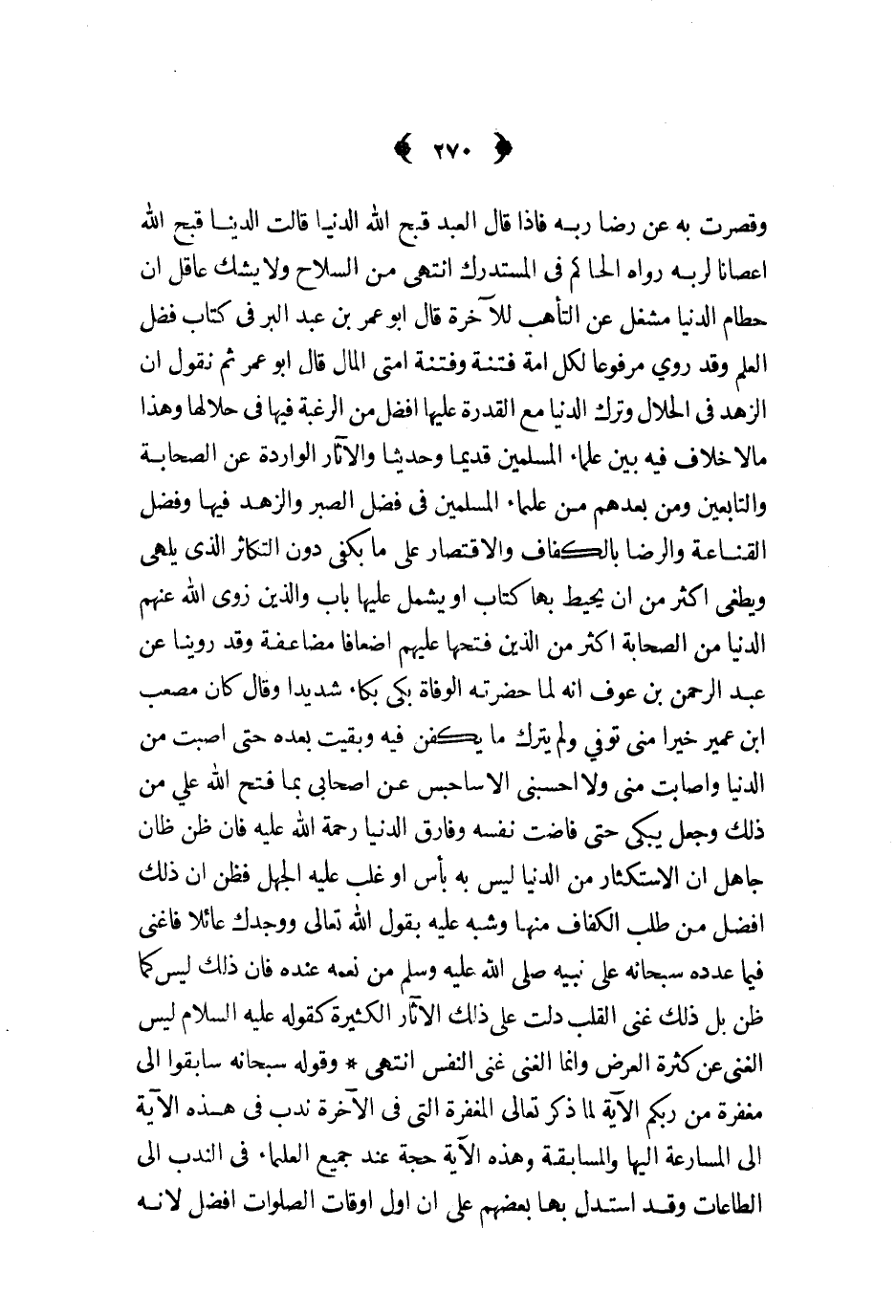 وقصرت به عن رضا ربه فإذا قال العبد قبح الله الدنيا قالت الدنيا قبح الله أعصانا لربه رواية الحاكم في المستدرك انتهى من السلاح ولا يشك عاقل أن حطام الدنيا مشغل عن التأهب للآخرة قال أبو عمر بن عبد البر في كتاب فضل العلم وقد روي مرفوعا لكل أمة فتنة وفتنة أمتي المال قال أبو عمر ثم نقول إن الزهد في الحلال وترك الدنيا مع القدرة عليها أفضل من الرغبة فيها في حلالها وهذا ما لا خلاف فيه بين علماء المسلمين قديما وحديثا والآثار الواردة عن الصحابة والتابعين ومن بعدهم من علماء المسلمين في فضل الصبر والزهد فيها وفضل القناعة والرضا بالكفاف والاقتصار على ما يكفي دون التكاثرالذي يلهي ويطغى أكثر من أن يحيط بها كتاب أو يشمل عليها باب والذين زوى الله عنهم الدنيا من الصحابة أكثر من الذين فتحها عليهم أضعافا مضاعفة وقد روينا عن عبد الرحمن بن عوف أنه لما حضرته الوفاة بكى بكاء شديدا وقال كان مصعب بن عمير خيرا مني توفي ولم يترك ما يكفن فيه وبقيت بعده حتى أصبت من الدنيا وأصابت مني ولا أحسبني إلا سأحبس عن أصحابي بما فتح الله علي من ذلك وجعل يبكي حتى فاضت نفسه وفارق الدنيا رحمة الله عليه فإن ظن ظان جاهل أن الاستكثار من الدنيا ليس به بأس أو غلب عليه الجهل فظن أن ذلك أفضل من طلب الكفاف منها وشبه عليه بقول الله تعالى ووجدك عائلا فأغنى فيما عدده سبحانه على نبيه ص - من نعمه عنده فإن ذلك ليس كما ظن بل ذلك غنى القلب دلت على ذلك الآثار الكثيرة كقوله عليه السلام ليس الغنى عن كثرة العرض وإنما الغنى غنى النفس انتهى