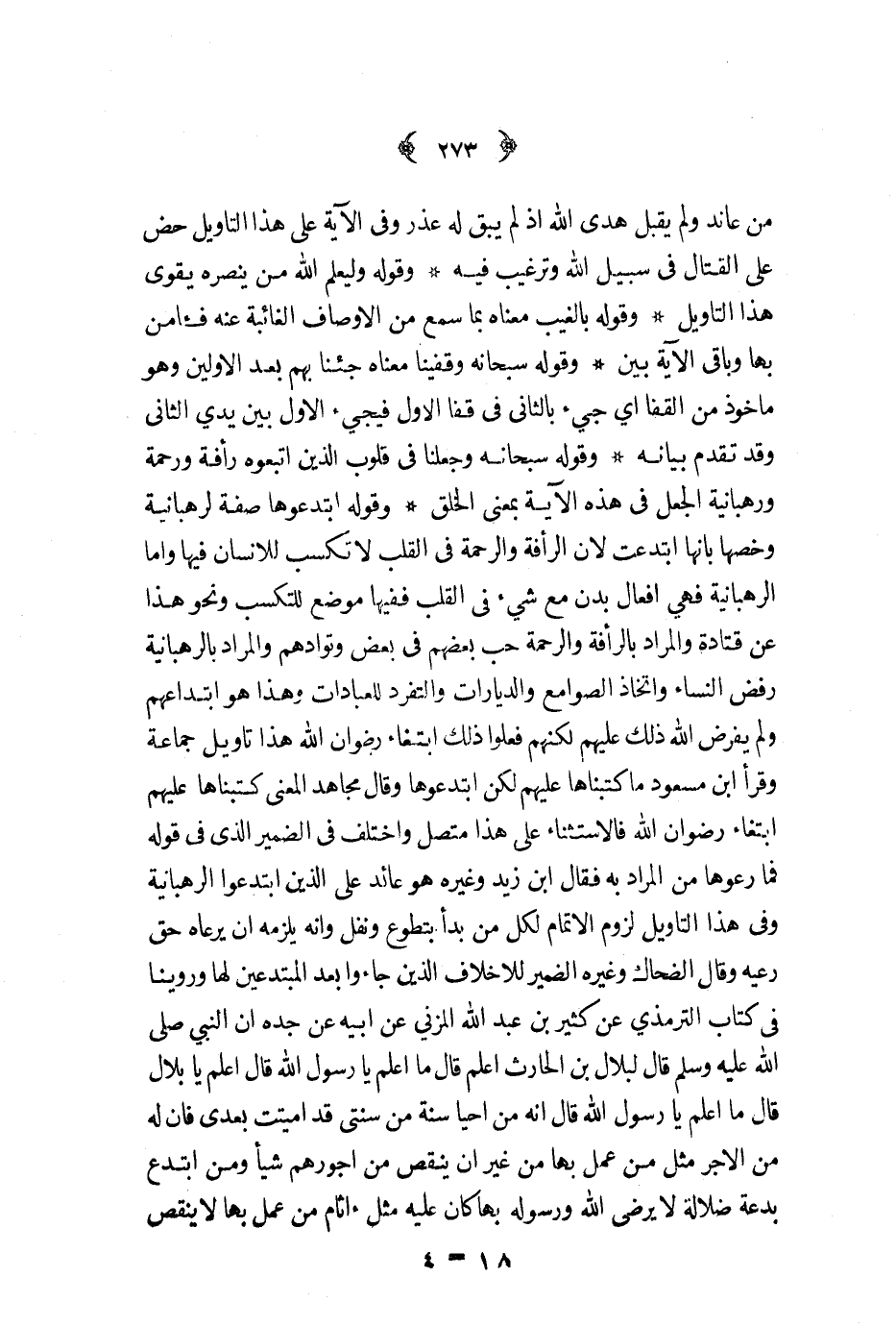 وقوله ابتدعوها صفة لرهبانية وخصها بأنا ابتدعت لأن الرأفة والرحمة في القلب لا تكسب للإنسان فيها وأما الرهبانية فهي أفعال بدن مع شيء في القلب ففيها موضع للتكسب ونحو هذا عن قتادة والمراد بالرأفة والرحمة حب بعضهم في بعض وتوادهم والمراد بالرهبانية رفض النساء واتخاذ الصوامع والديارات والتفرد للعبادات وهذا هو ابتداعهم ولم يفرض الله ذلك عليهم لكنهم فعلوا ذلك ابتغاء رضوان الله هذا تأويل جماعة وقرأ ابن مسعود ما كتبناها عليهم لكن ابتدعوها وقال مجاهد المعنى كتبناها عليهم ابتغاء رضوان الله فالاستثناء على هذا متصل واختلف في الضمير الذي في قوله فما رعوها من المراد به فقال ابن زيد وغيره هو عائد على الذين ابتدعوا الرهبانية وفي هذا التأويل لزوم الإتمام لكل من بدأ بتطوع ونفل وأنه يلزمه أن يرعاه حق رعيه وقال الضحاك وغيره الضمير للأخلاف الذين جاءوا بعد المبتدعين لها وروينا في كتاب الترمذي عن كثير بن عبد الله المزني عن أبيه عن جده أن النبي ص - قال لبلال بن الحارث اعلم قال ما أعلم يا رسول الله قال اعلم يا بلال قال ما أعلم يا رسول الله قال أنه من أحيا سنة من سنتي قد أميتت بعدي فإن له من الأجر مثل من عمل بها من غير أن ينقص من أجورهم شيئا ومن ابتدع ضلالة لا يرضى الله ورسوله بها كان عليه مثل آثام من عمل بها لا ينقص