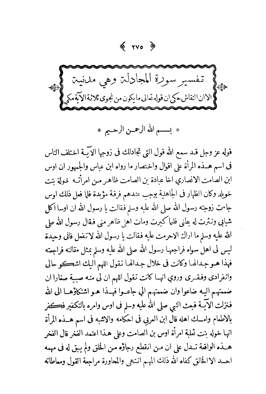 قوله عز و جل قد سمع الله قول التي تجادلك في زوجها الآية اختلف الناس في اسم هذه المرأة على أقوال واختصار ما رواه ابن عباس والجمهور أن أوس بن الصامت الأنصاري أخا عبادة بن الصامت ظاهر من امرأته خولة بنت خويلد وكان القهار في الجاهلية يوجب عندهم فرقة مؤبدة فلما فعل ذلك أوس جاءت زوجته رسول الله ص - فقالت يا رسول الله إن أوسا أكل شبابي ونثرت له بطني فلما كبرت ومات أهلي ظاهر مني فقال رسول الله ص - ما أراك إلا حرمت عليه فقالت يا رسول الله لا تفعل فإني وحيدة ليس لي أهل سواه فراجعها رسول الله ص - بمثل مقالته فراجعته فهذا هو جدالها وكانت في خلال جدالها تقول اللهم إليك أشكو حالي وانفرادي وفقري وروي أنها كانت تقول اللهم إن لي منه صبية صغارا إن ضممتهم إليه ضاعوا وإن ضممتهم إلي جاعوا فهذا هو اشتكاؤها إلى الله فنزلت الآية فبعث النبي ص - في أوس وأمره بالتكفير فكفر بالإطعام وأمسك أهله قال ابن العربي في أحكامه والأشبه في اسم هذه المرأة أنها خولة بنت ثعلبة امرأة أوس بن الصامت وعلى هذا اعتمد الفخر قال الفخر هذه الواقعة تدل على أن من انقطع رجاؤه من الخلق ولم يبق له في مهمه أحد إلا الخالق كفاه الله ذلك المهم انتهى والمحاورة مراجعة القول ومعاطاته