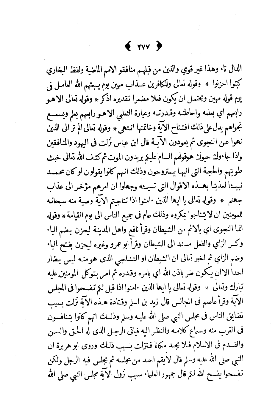 وقوله تعالى يا أيها الذين آمنوا إذا قيل لكم تفسحوا في المجلس الآية وقرأ عاصم في المجالس قال زيد بن أسلم وقتادة هذه الآية نزلت بسبب تضايق الناس في مجلس النبي ص - وذلك أنهم كانوا يتنافسون في القرب منه وسماع كلامه والنظر إليه فيأتي الرجل الذي له الحق والسن والقدم في الإسلام فلا يجد مكانا فنزلت بسبب ذلك وروى أبو هريرة أن النبي ص - قال لا يقم أحد من مجلسه ثم يجلس فيه الرجل ولكن تفسحوا يفسح الله لكم قال جمهور العلماء سبب نزول الآية مجلس النبي ص