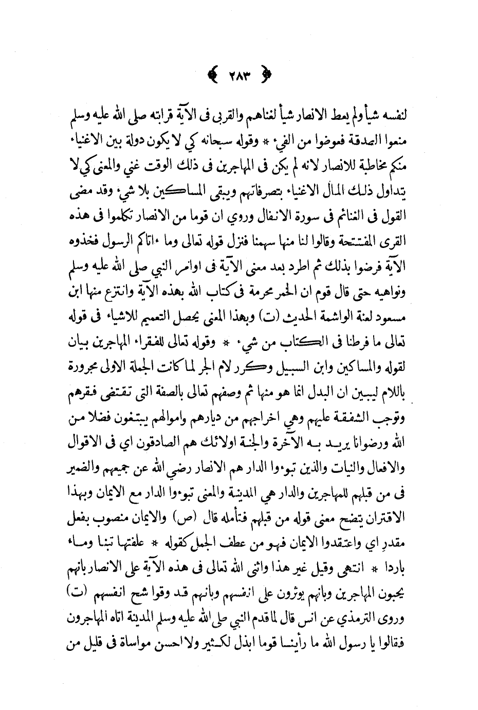 علفتها تبنا وماء باردا انتهى وقيل غير هذا وأثنى الله تعالى في هذه الآية على الأنصار بأنهم يحبون المهاجرين وبأنهم يؤثرون على أنفسهم وبأنهم قد وقوا شح أنفسهم ت وروى الترمذي عن أنس قال لما قدم النبي ص - المدينة أتاه المهاجرون فقالوا يا رسول الله ما رأينا قوما ابذل لكثير ولا أحسن مواساة في قليل من