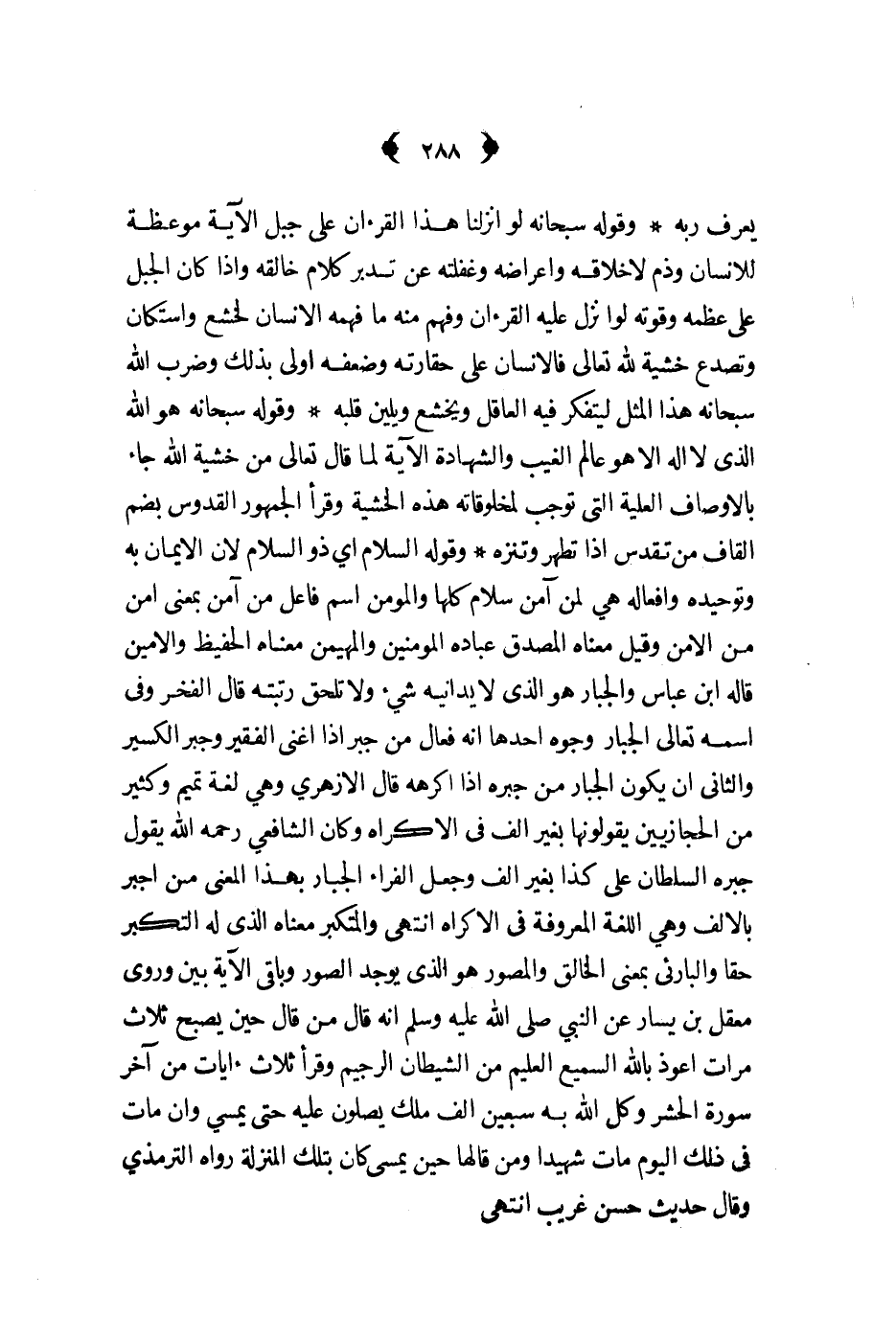وقوله السلام أي ذو السلام لأن الإيمان به وتوحيده وأفعاله هي لمن آمن سلام كلها والمؤمن اسم فاعل من آمن بمعنى آمن من الأمن وقيل معناه المصدق عباده المؤمنين والمهيمن معناه الحفيظ والأمين قاله ابن عباس والجبار هو الذي لا يدانيه شيء ولا تلحق رتبته قال الفخر وفي اسمه تعالى الجبار وجوه أحدها أنه فعال من جبر إذا أغنى الفقير وجبر الكسير والثاني أن يكون الجبار من جبره إذا اكرهه قال الأزهري وهي لغة تميم وكثير من الحجازيين يقولونها بغير ألف في الإكراه وكان الشافعي رحمه الله يقول جبره السلطان على كذا بغير ألف وجعل الفراء الجبار بهذا المعنى من أجبر بالأفل وهي اللغة المعروفة في الإكراه انتهى والمتكبر معناه الذي له التكبر حقا والباريء بمعنى الخالق والمصور هو الذي يوجد الصور وباقي الآية بين وروى معقل بن يسار عن النبي ص - أنه قال من قال حين يصبح ثلاث مرات أعوذ بالله السميع العليم من الشيطان الرجيم وقرأ ثلاث آيات من آخر سورة الحشر وكل الله به سبعين ألف ملك يصلون عليه حين يمسي وإن مات في ذلك اليوم مات شهيدا ومن قالها حين يمسي كان بتلك المنزلة رواه الترمذي وقال حديث حسن غريب انتهى