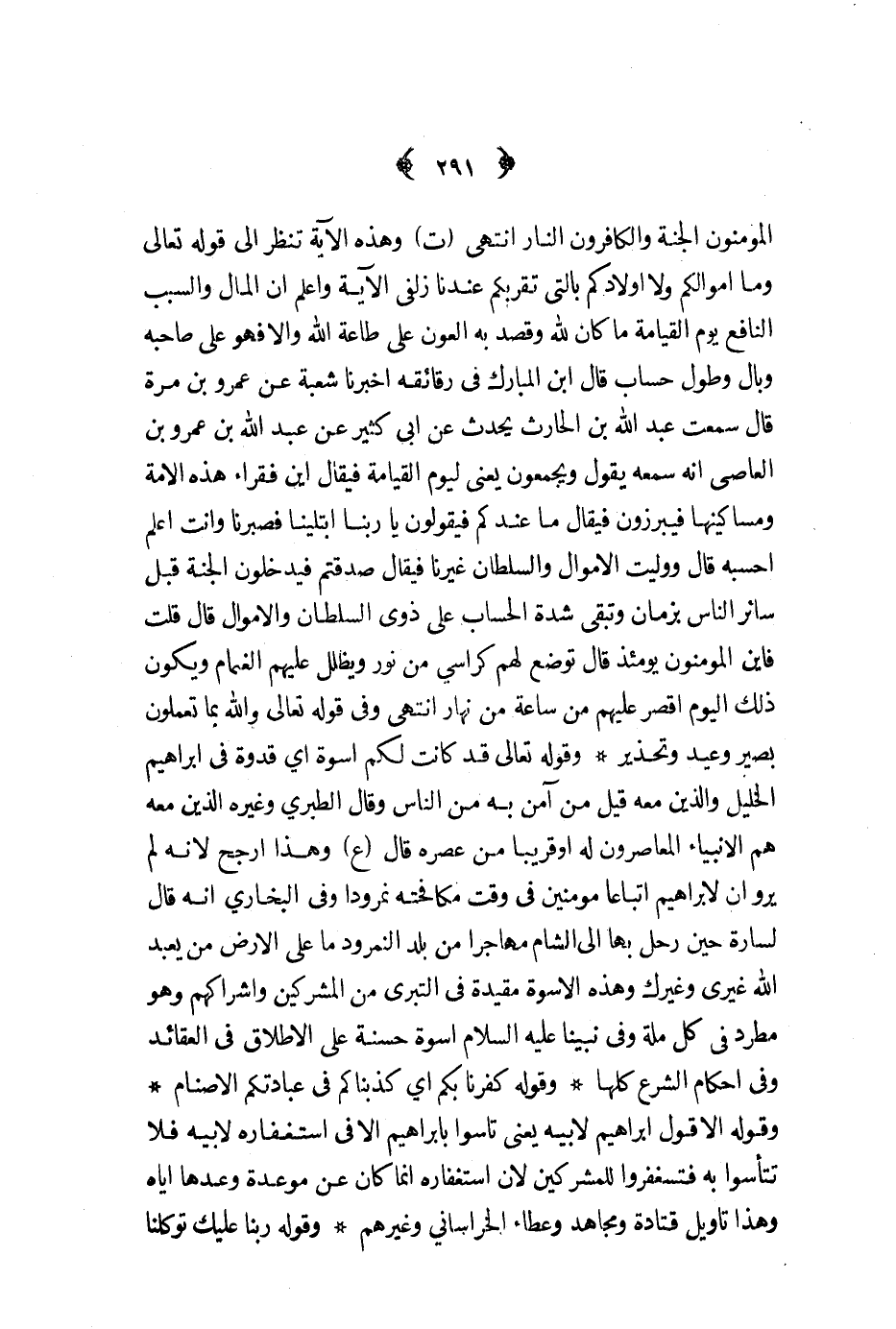 وقوله تعالى قد كانت لكم أسوة أي قدوة في إبراهيم الخليل والذين معه قيل من آمن به من الناس وقال الطبري وغيره الذين معه هم الأنبياء المعاصرون له أو قريبا من عصره قال ع وهذا أرجح لأنه لم يرو أن لإبراهيم أتباعا مؤمنين في وقت مكافحته نمرودا وفي البخاري أنه قال لسارة حين رحل بها إلى الشام مهاجرا من بلد النمرود ما على الأرض من يعبد الله غيري وغيرك وهذه الأسوة مقيدة في التبري من المشركين وإشراكهم وهو مطرد في كل ملة وفي نبينا عليه السلام أسوة حسنة على الإطلاق في العقائد وفي أحكام الشرع كلها