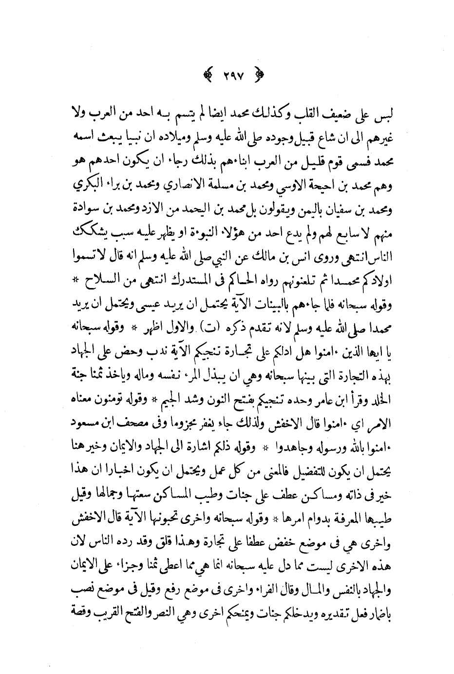 ليس على ضعيف القلب وكذلك محمد أيضا لم يتسم به أحد من العرب ولا غيرهم إلى أن شاع قبيل وجوده ص - وميلاده أن نبيا يبعث اسمه محمد فسمى قوم قليل من العرب أبناءهم بذلك رجاء أن يكون أحدهم هو وهم محمد بن احيحة الأوسي ومحمد بن سلمة الأنصاري ومحمد بن براء البكري ومحمد بن سفيان باليمن ويقولون بل محمد بن اليحمد بن الأزد ومحمد بن سوادة منهم لا سابع لهم ولم يدع أحد من هؤلاء النبوءة أو يظهر عليه سبب يشكك الناس انتهى وروى أنس بن مالك عن النبي ص - أنه قال لا تسموا أولادكم محمدا ثم تلعنونهم رواه الحاكم في المستدرك انتهى من السلاح